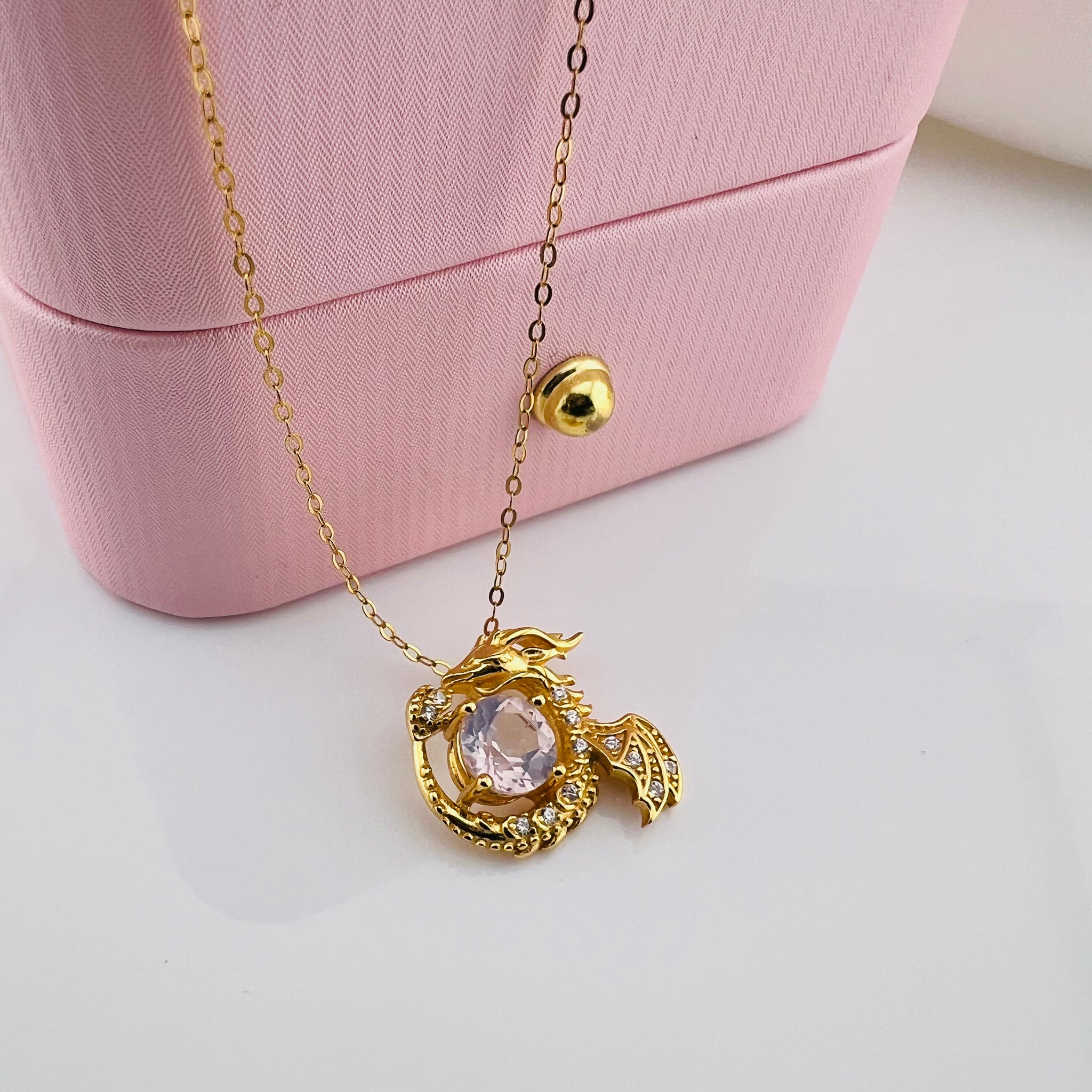 Unleash your inner fire with our exquisite Flying Dragon Pendant Necklace with Natural Lavender Quartz. Crafted with precision and high quality materials such as 925 silver dipped 5 times in 18k gold, this gorgeous piece is not only affordable, but also sure to turn heads wherever you go. Embrace the mystical charm of the dragon with this captivating accessory.