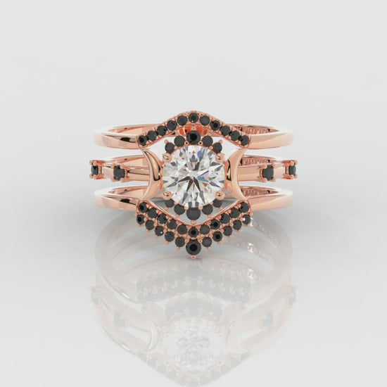 Inspired by the night sky, the Full Moon Engagement Ring symbolizes eternal love and celestial beauty. Handcrafted in 14K rose gold with a black diamond alternative and sparkling white stones, it’s perfect for gothic brides, alternative weddings, and dark romance lovers—a ring that shines as brightly as your love.