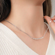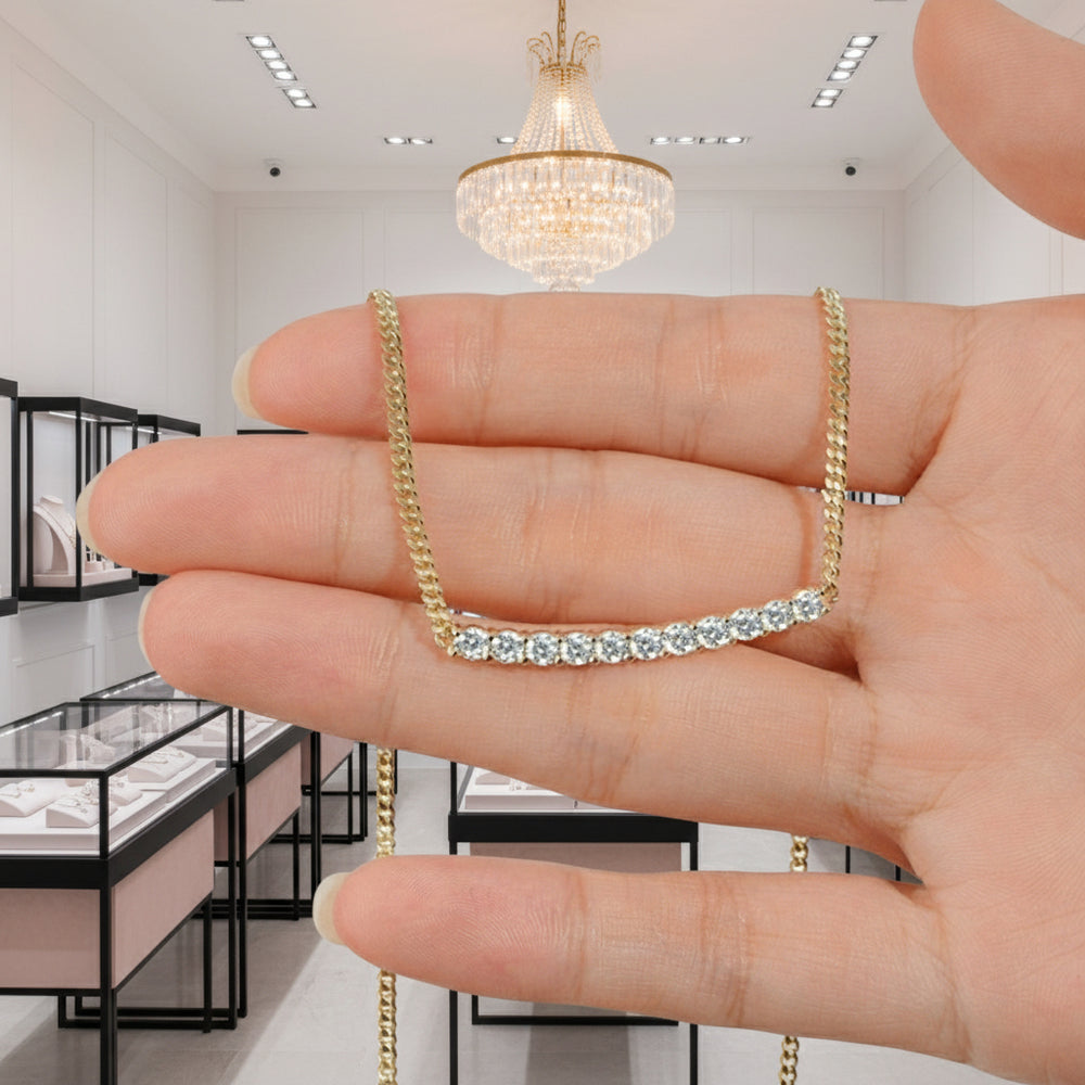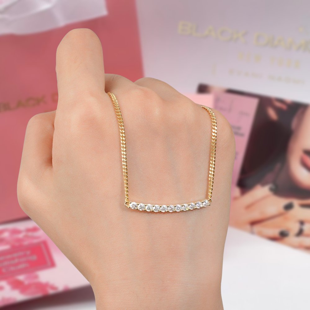 Elevate your look with our Gorgeous Round Cut Certified Moissanite Diamond Pendant Necklace by Black Diamonds New York. This stunning necklace features eleven 3mm round cut moissanite stones that are guaranteed to sparkle and shine. Crafted with high quality 925 silver dipped 5x in 18k gold, this necklace is not only affordable but also exudes luxury.