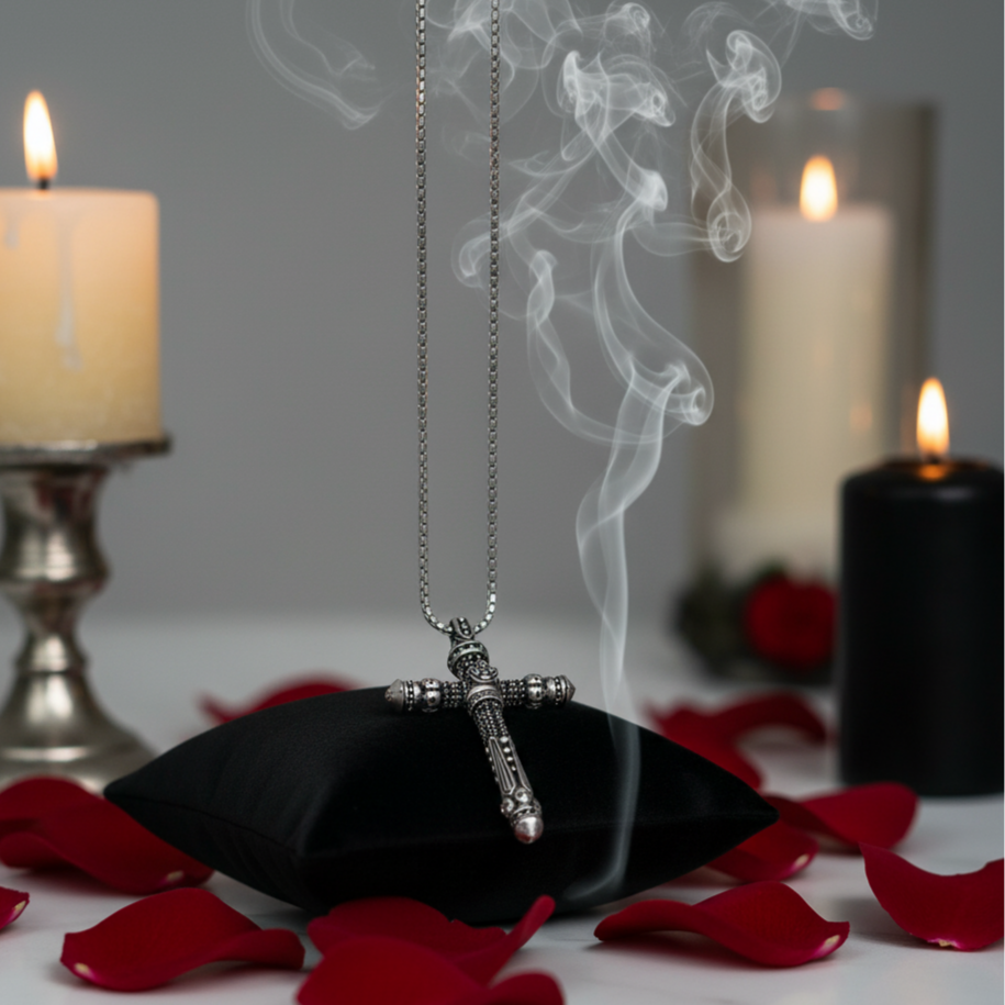 Unleash the inner rebel in you and accessorize with this exquisite Gothic Cross Pave Diamond Alternative Sword Necklace from Black Diamonds- New York. Crafted in 92.5% pure silver and 7.5% hypoallergenic metals with the utmost skill and attention to detail. This necklace will become the envy of every eye in the room. It's vintage-style pendant is 3.3 x 5.5 cm in size and encrusted with black stones, paired with a sophisticated link chain. You'll never go wrong with this piece, look mysterious while you rock it with any outfit!