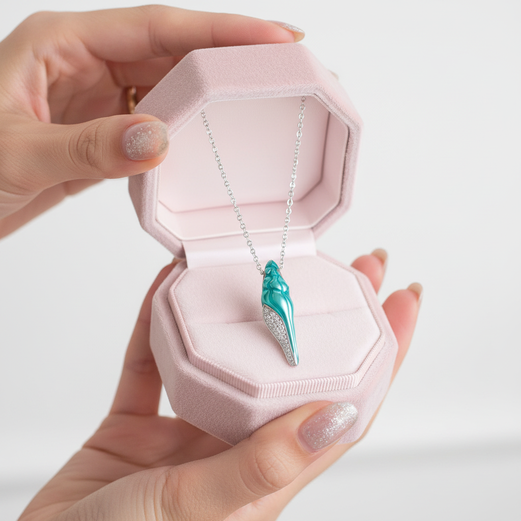 Add a pop of color to your outfit with our Green Enamel Conch Shell Pendant Necklace. This striking piece is adorned with round EVN stones that shimmer in the light. Made with high quality 925 silver dipped 5x in 18k white gold, this necklace is not only gorgeous but also budget-friendly. Elevate your style with this exquisite accessory.
