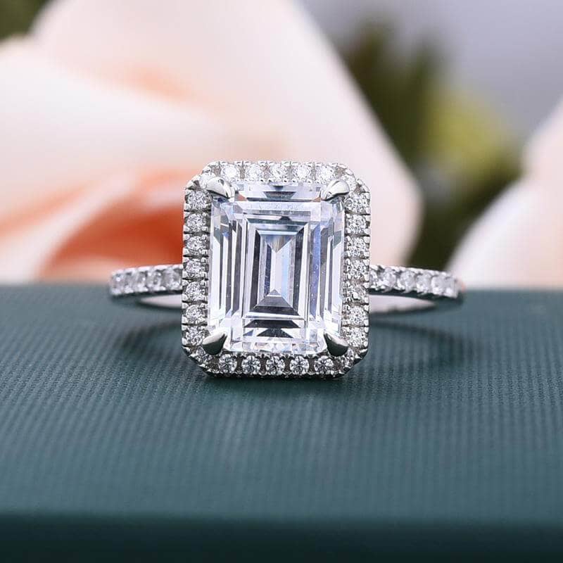 Halo Emerald Cut Ring & Diamond Wedding Band Set
