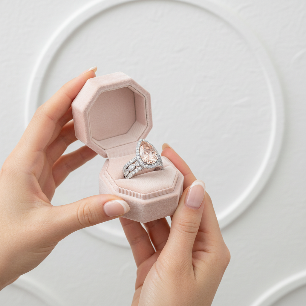 A three-piece white gold ring set showcasing a radiant 3-carat pear-cut morganite center stone with a halo of sparkling accents. The soft peachy-pink morganite pairs beautifully with white gold, creating an elegant look for engagements, anniversaries, or everyday wear. Wear the pieces together or separately.
