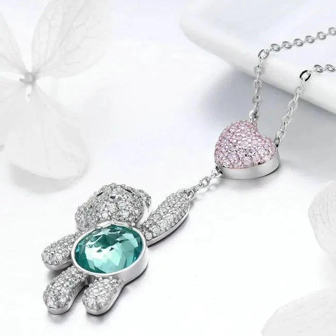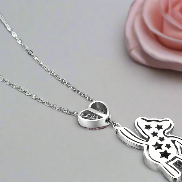 Heart And Cute Bear Pendant Necklace with Pink Diamond