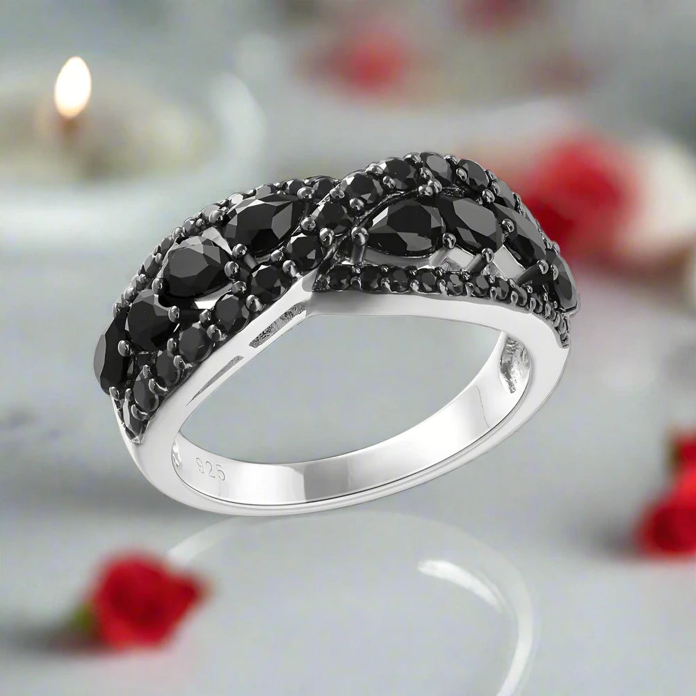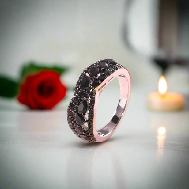Crafted from high-quality 925 sterling silver, this ring features a striking pear-cut natural black spinel stone. The deep black color is captivating, and the tension mount setting adds a modern touch. This ring is both stylish and comfortable to wear. Elevate your jewelry collection with this exquisite piece.