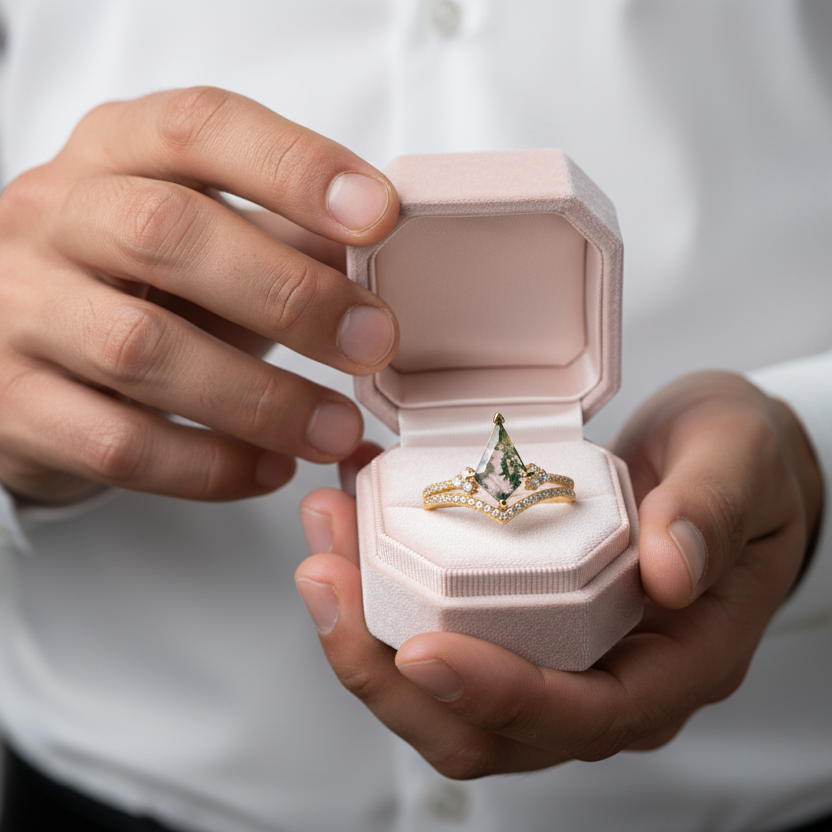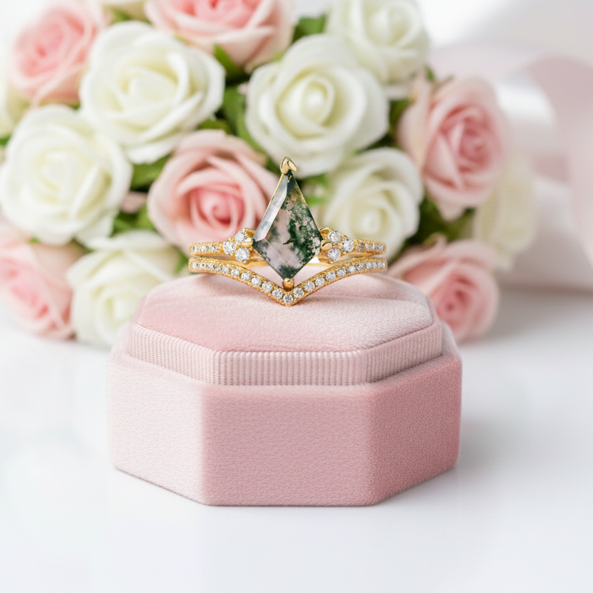 Kite Shaped Natural Moss Agate Promise Ring Set