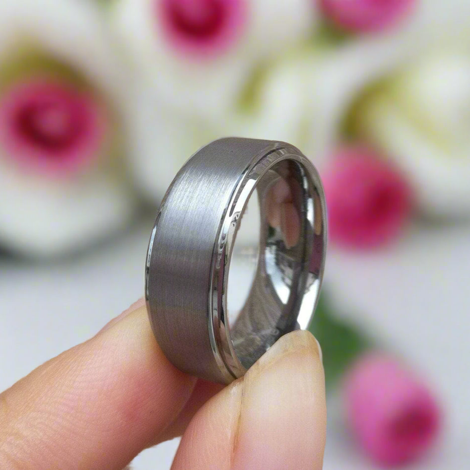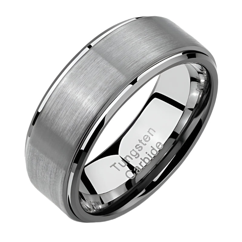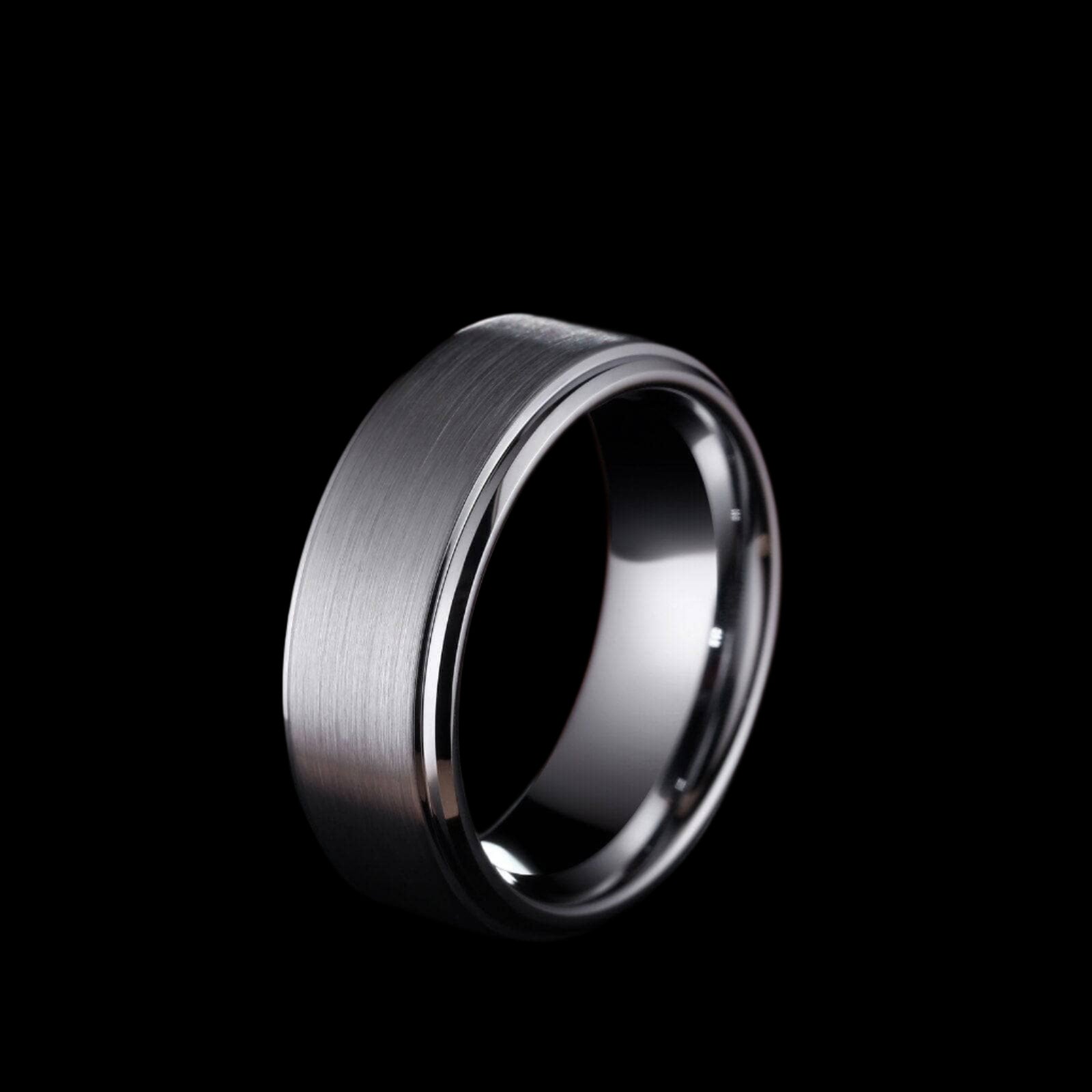 This men's wedding band is crafted from sturdy tungsten carbide and features an 8mm wide gray band. Its robust construction and contemporary finish make it a stylish and enduring choice to represent your lifelong commitment.
