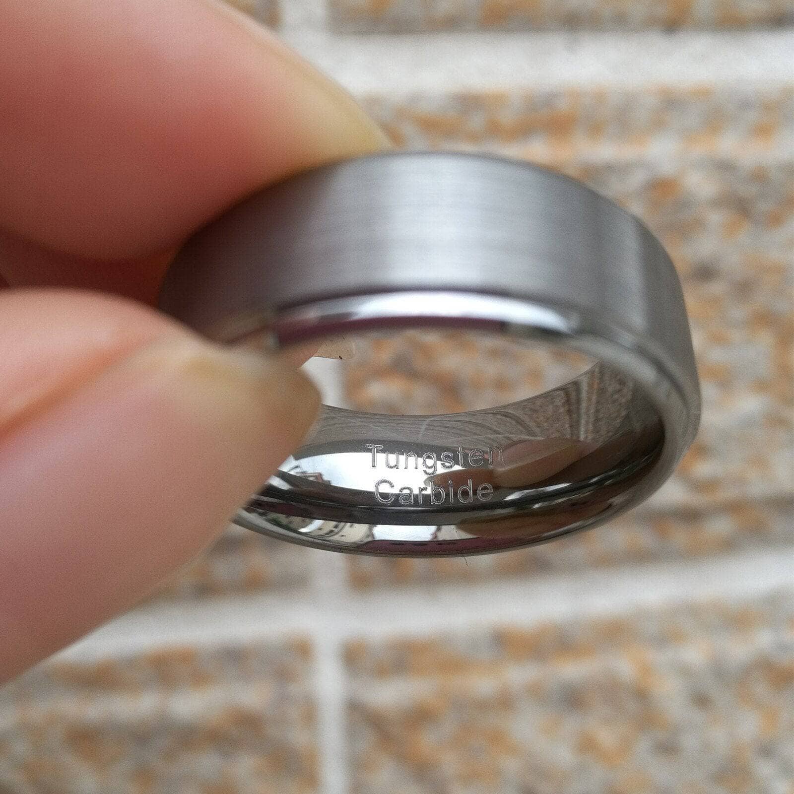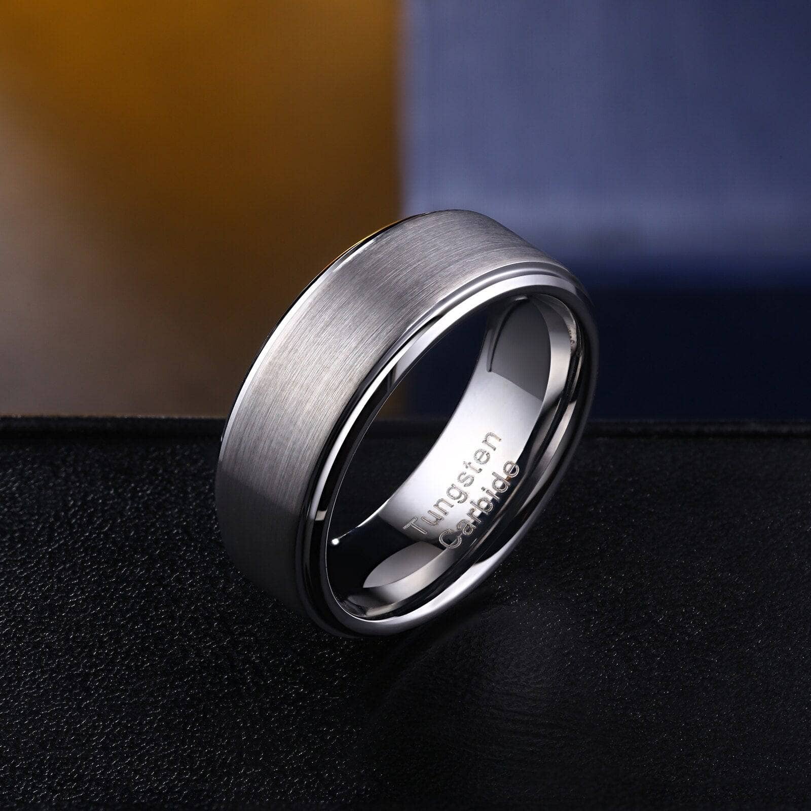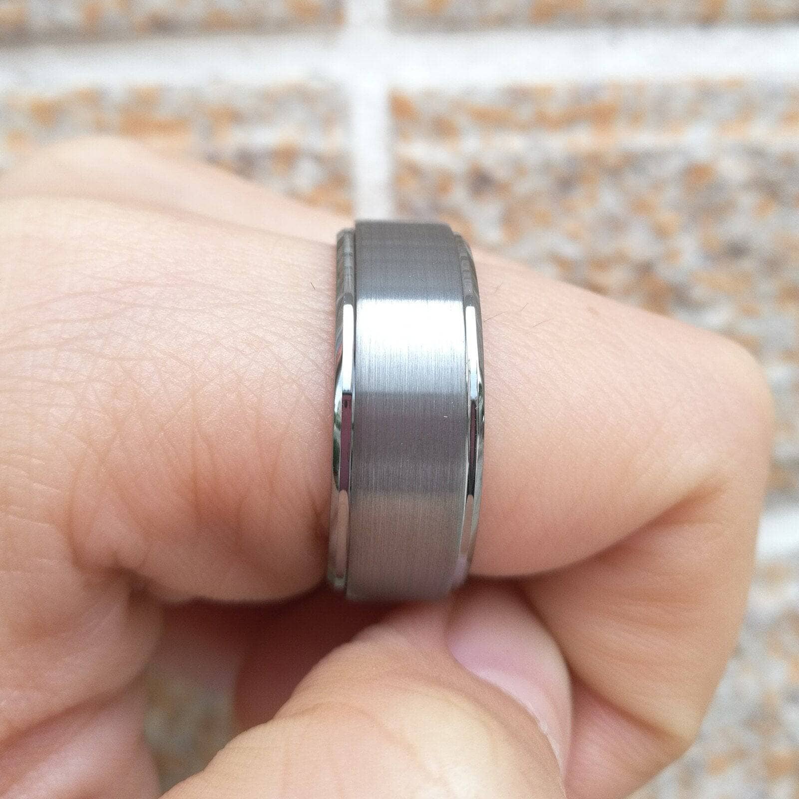 This men's wedding band is crafted from sturdy tungsten carbide and features an 8mm wide gray band. Its robust construction and contemporary finish make it a stylish and enduring choice to represent your lifelong commitment.
