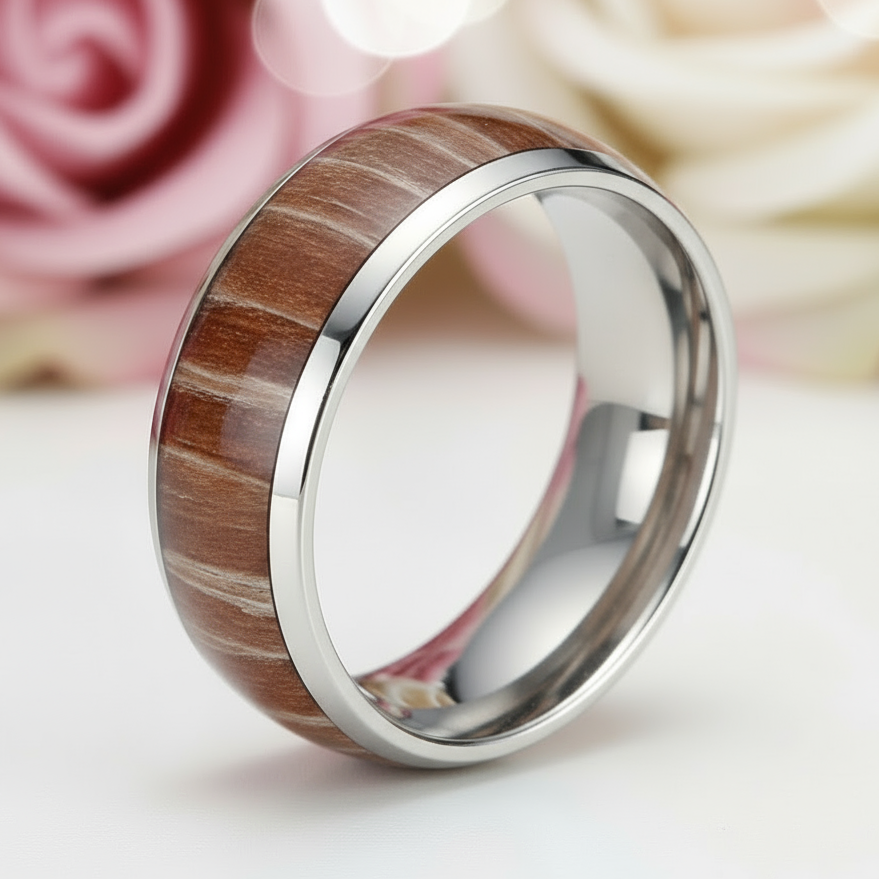 Crafted from premium, ethically sourced materials, this men's 8mm titanium wedding band with wood inlay offers lasting durability and unique style. Ditch the dull and overpriced rings choose a band that stands out and endures a lifetime.