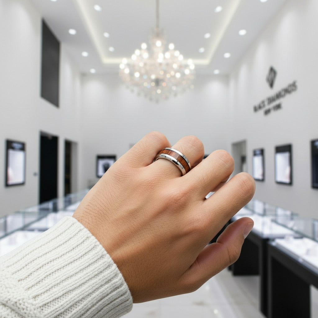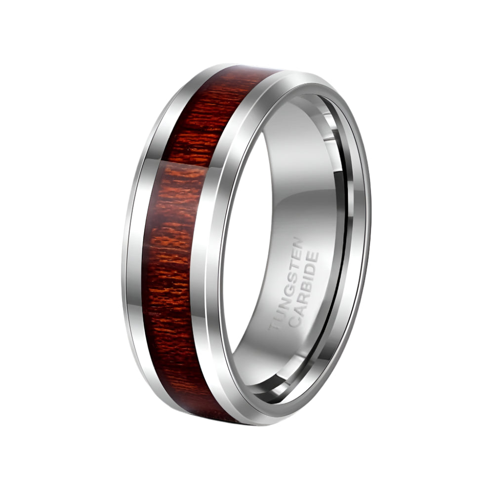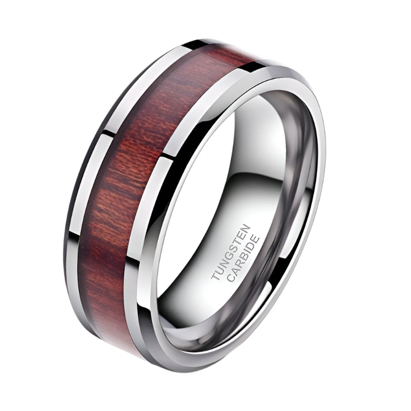 This 8mm men's wedding band combines durable tungsten with a stylish wooden inlay. Crafted from high-quality, ethical materials, it offers a unique and lasting alternative to traditional rings.