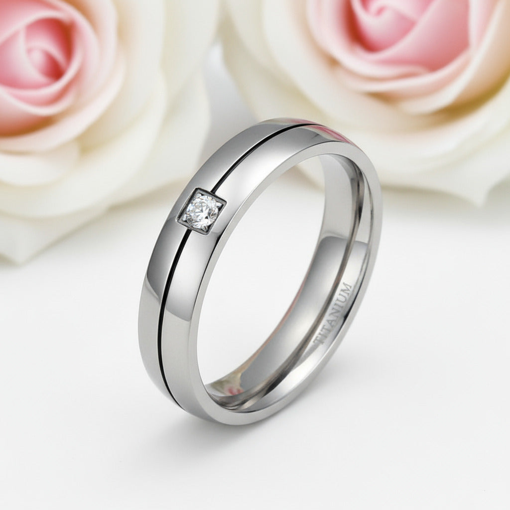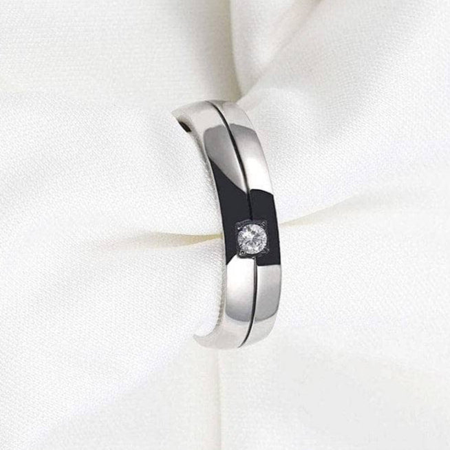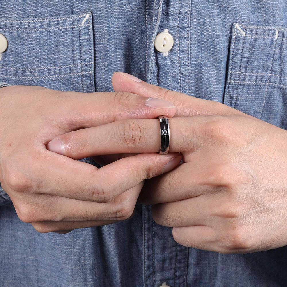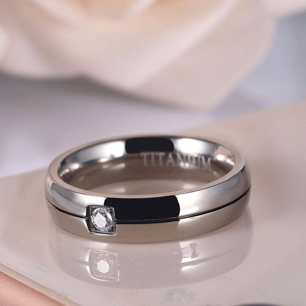 This men's titanium wedding band features a sparkling diamond and is crafted from durable, ethically sourced materials. It offers a stylish and lasting alternative to ordinary wedding rings.