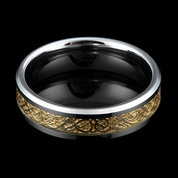 This men's tungsten carbide wedding band features a striking dragon inlay. Crafted from durable, ethically sourced materials, it offers lasting strength and unique style without the high price.
