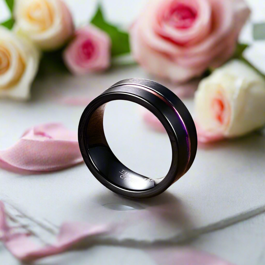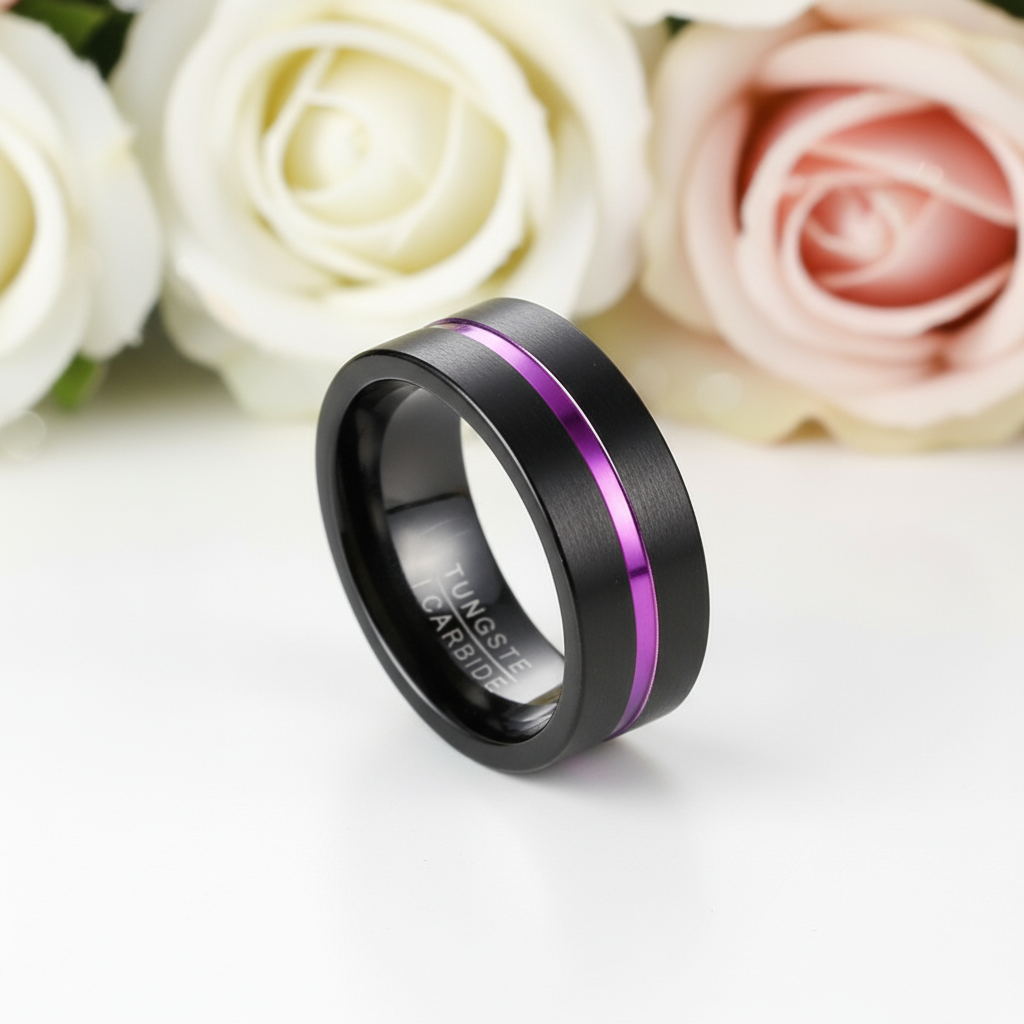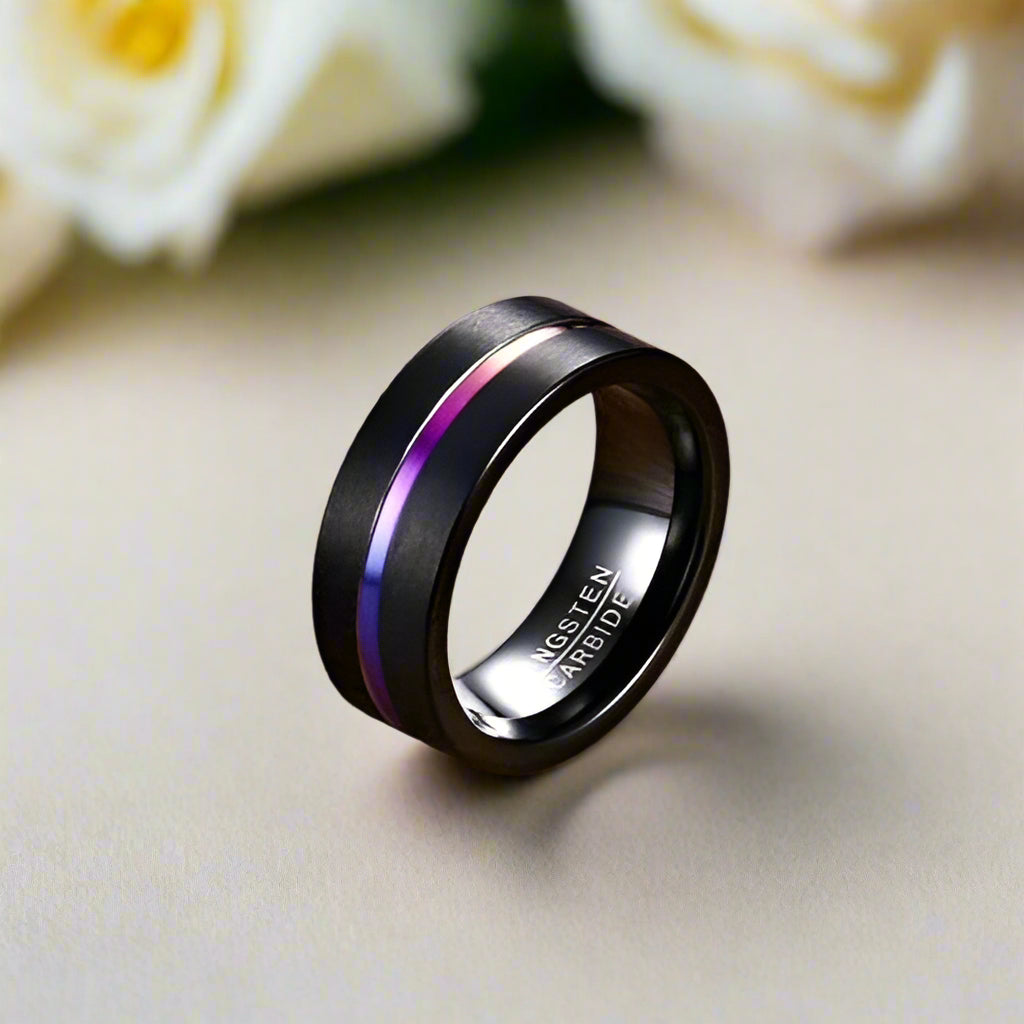 This men's tungsten wedding band features a unique rainbow line and is crafted from durable, ethically sourced materials. It offers a stylish and lasting alternative to ordinary wedding bands.