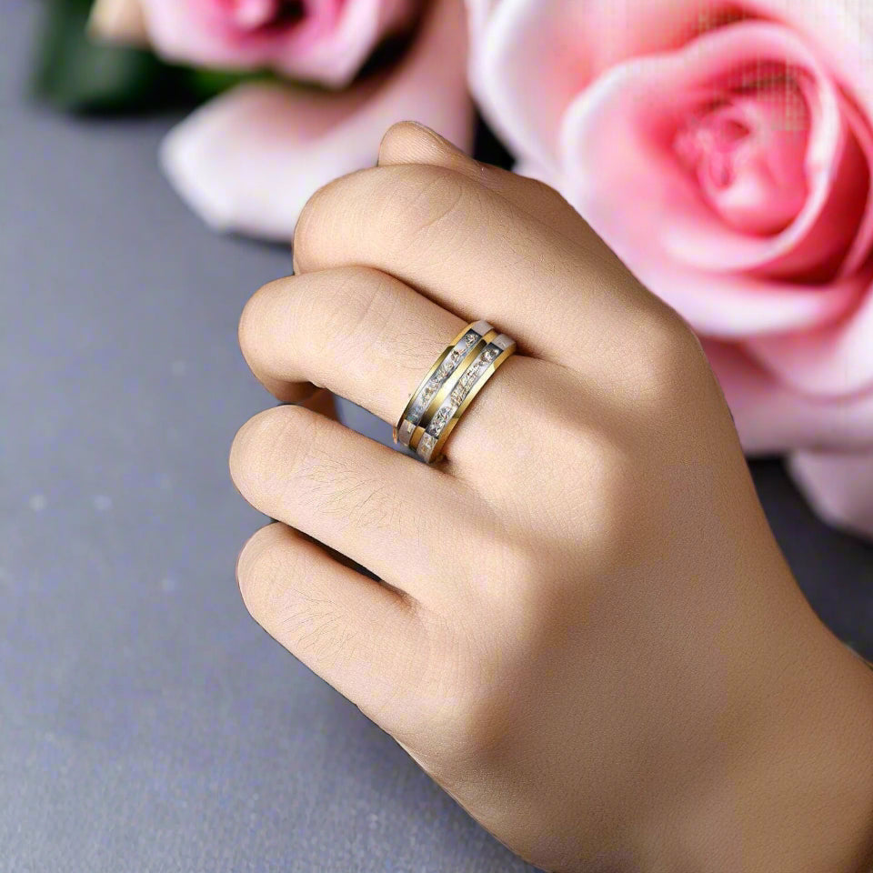 Crafted with precision, this 8mm Men's Wedding Band in Tungsten Carbide features a stunning golden gray finish that shines brilliantly like a diamond. Designed to symbolize your commitment, it’s the perfect ring for you, your partner, and the love you share.