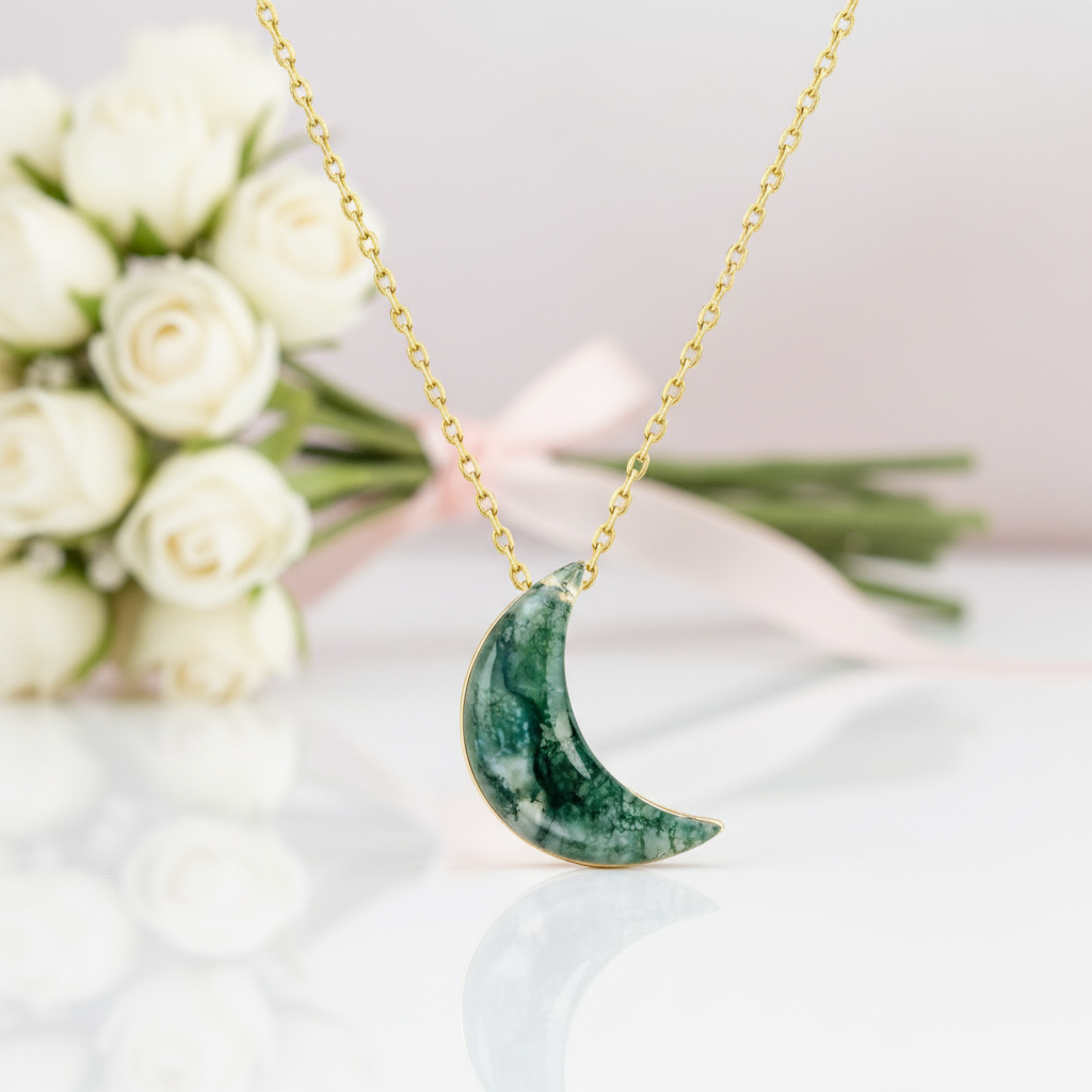 Upgrade your jewelry collection with this stunning Moon Shaped Moss Agate Necklace! Crafted with high-quality materials, including shimmering silver and the mesmerizing moss agate stone, this necklace offers both beauty and durability. Perfect for adding a touch of nature-inspired glamour to any outfit, this necklace is a must-have for any fashion-forward individual.