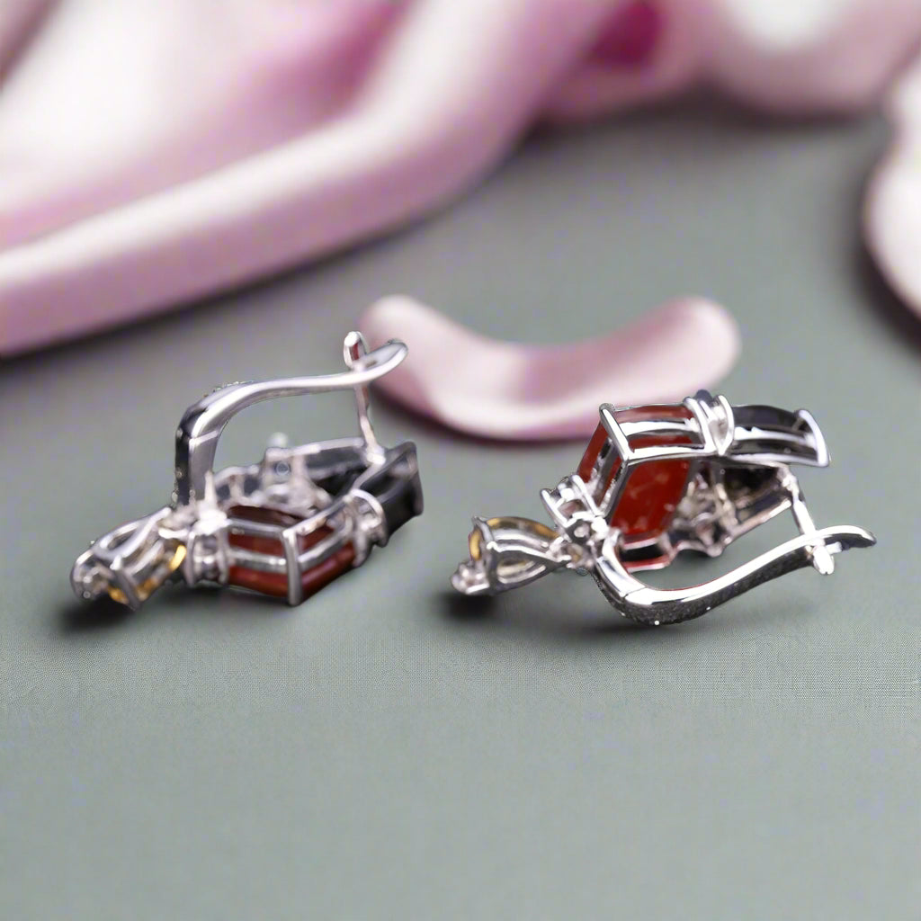 These exquisite drop earrings feature natural Carnelian as the centerpiece, elegantly handcrafted for a refined look. Set in 925 sterling silver, each pair is complemented by side stones such as Smoky Quartz, Citrine and a diamond alternative, adding subtle sophistication to your ensemble.