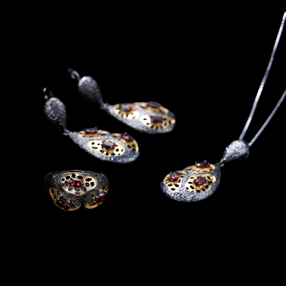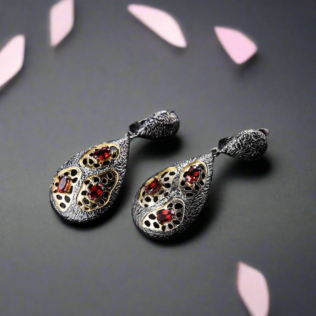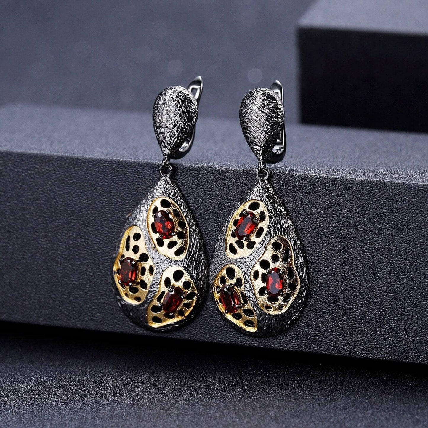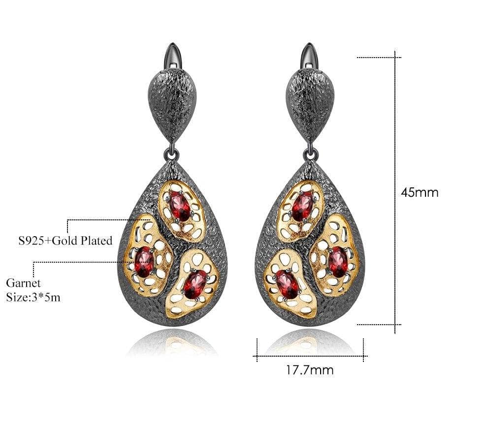 Crafted with natural garnet as the centerpiece, these handmade drop earrings showcase a blend of 925 sterling silver and gold plating, offering a refined and elegant design.