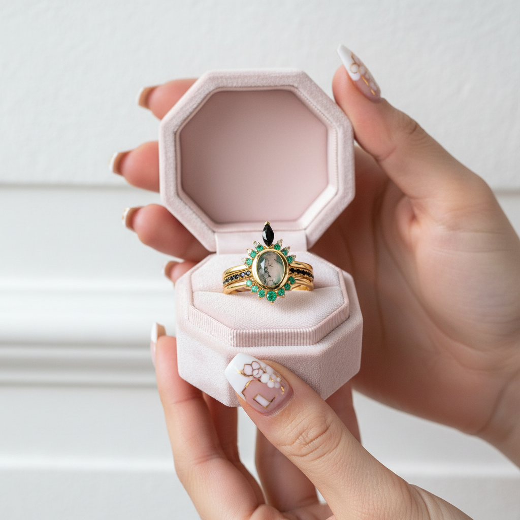 Oval cut Natural Moss Agate Yellow Gold Wedding Ring Set
