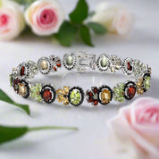 Experience the stunning beauty of our Oval-cut Natural Multi Gemstone Flower Halo Bracelet, featuring high-quality 925 sterling silver and a variety of vibrant rhodolite, peridot, citrine, and black spinel gemstones. With an elegant oval, pear, and round stone shape, this beautiful piece is sure to make a statement. Treat yourself to a luxurious piece of jewelry that will add a touch of sparkle to any outfit!