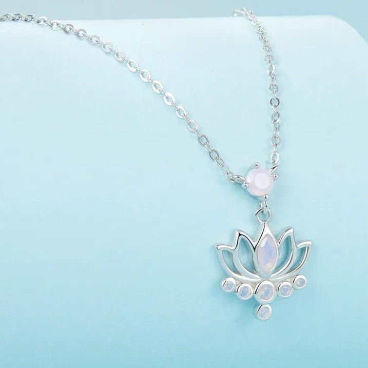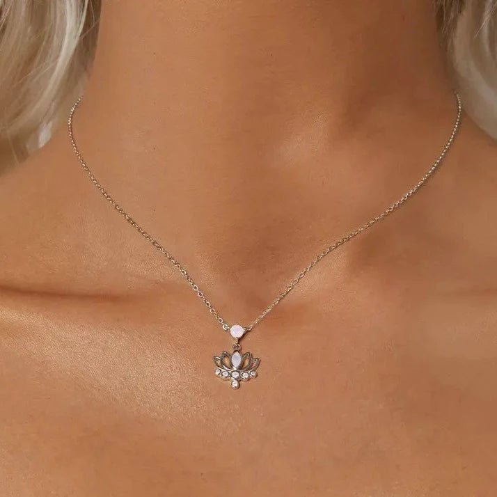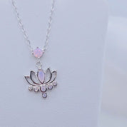 Pink Opal Lotus Flower Pendant Necklace featuring a stunning pink stone centerpiece set in 925 silver with white gold plating. The lotus flower symbolizes purity and enlightenment, making this piece both beautiful and meaningful. Crafted for durability and designed to turn heads, it's the perfect blend of luxury and affordability.