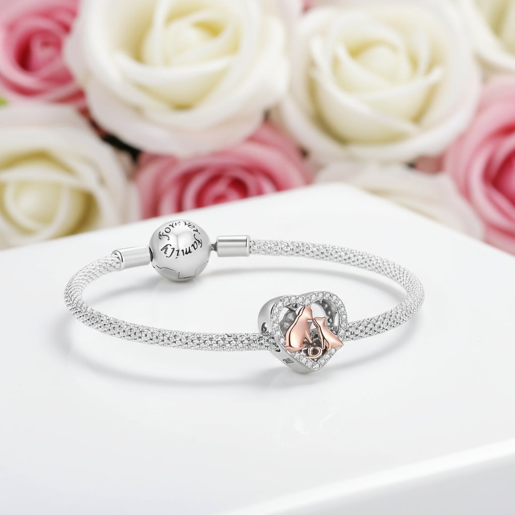 Add a playful touch to your accessories with our Playful Pet Kissing Cat Charm. This charming piece features stunning round stones set in 925 silver dipped 5x Platinum & Rose Gold, giving it a luxurious look without the hefty price tag. Treat yourself to this gorgeous charm today and elevate your jewelry game!