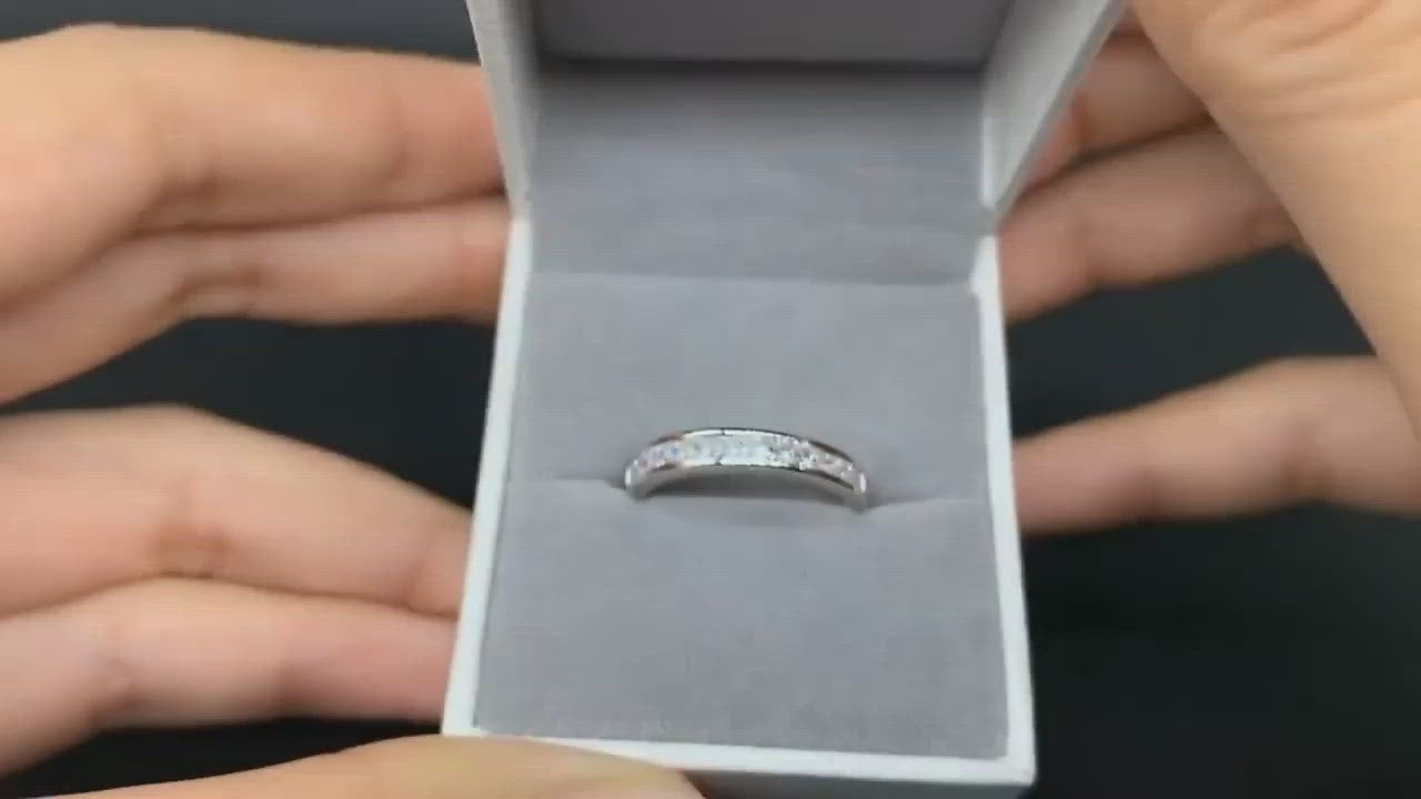 Indulge in the regal elegance of our Princess-Cut Diamond Channel-Set Half-Eternity Band, crafted with the finest 925 sterling silver. The main stone, a stunning created diamond, is accentuated by sparkling side stones with a combined 0.36 carat weight. With a delicate 3.0mm ring width and a weight of 3g, this band embodies luxury and sophistication.
