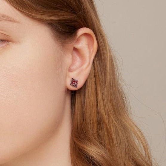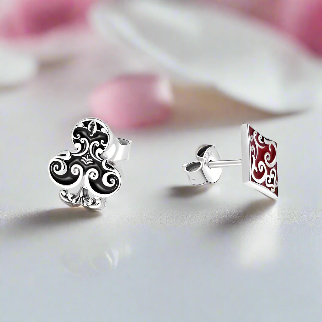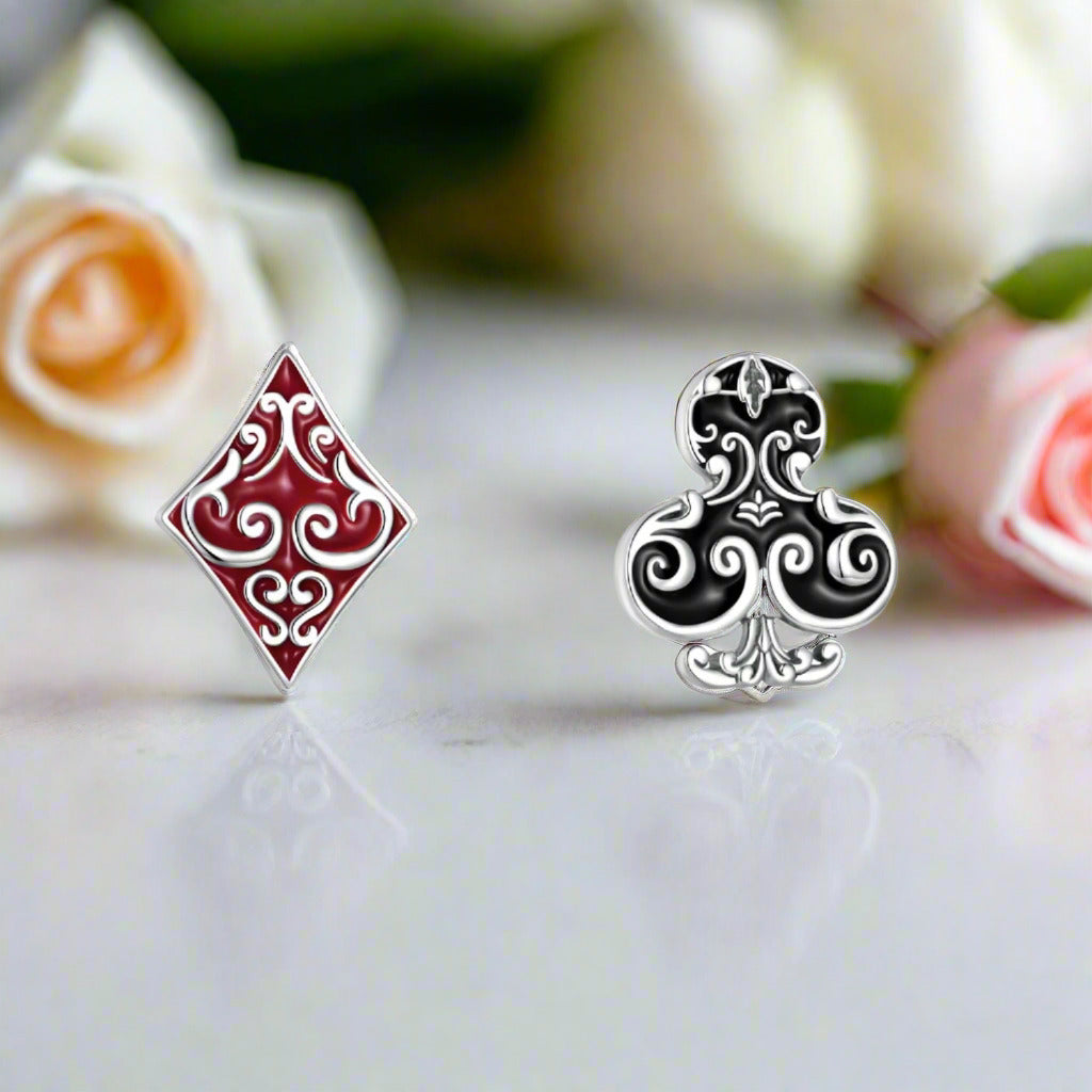 Add a stylish edge to your look with the Punk Asymmetric Poker Card Symbols Stud Earrings from Black Diamonds New York. Made from hypoallergenic 92.5% silver, these earrings showcase unique clover and diamond designs with a bold red-black asymmetrical finish. Perfect for a refined, adventurous touch.