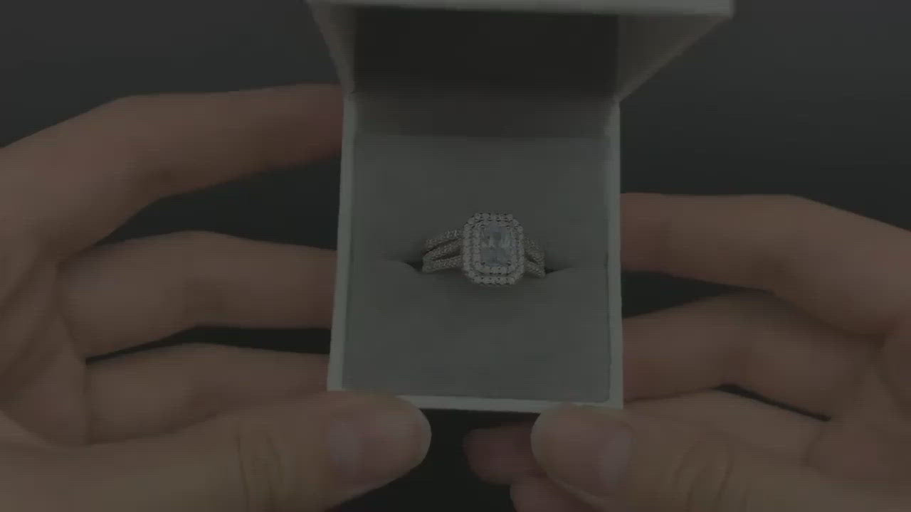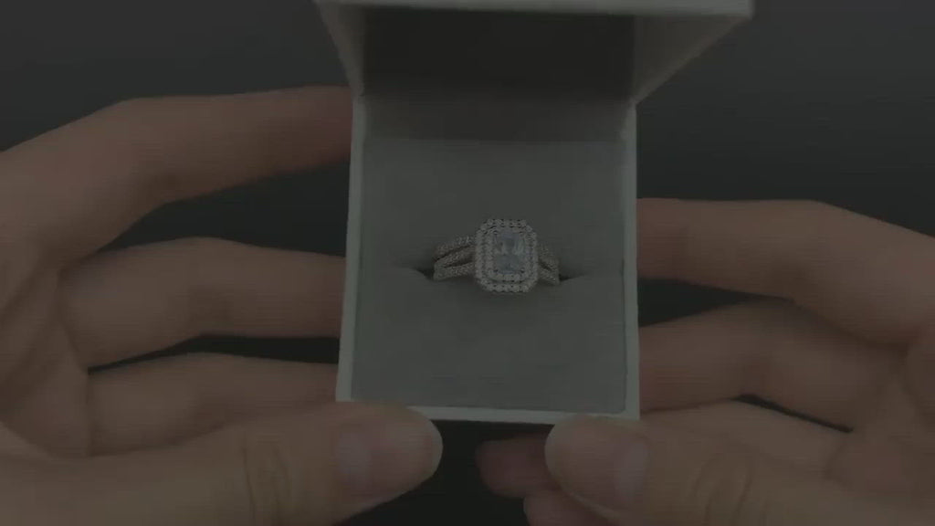 Radiant-Cut Diamond Double-Halo Split Shank Ring Set