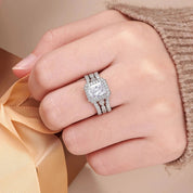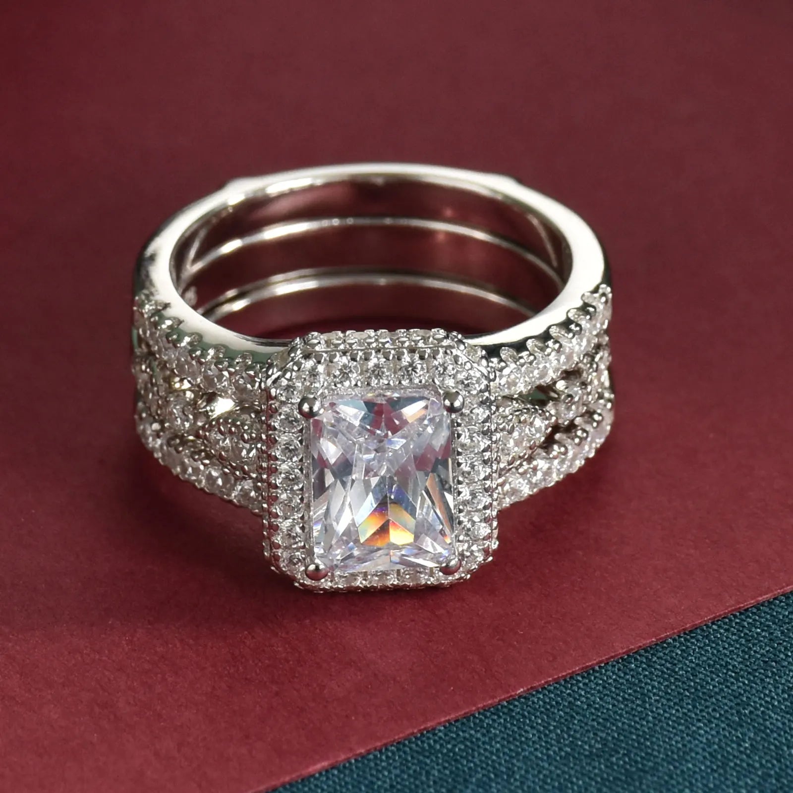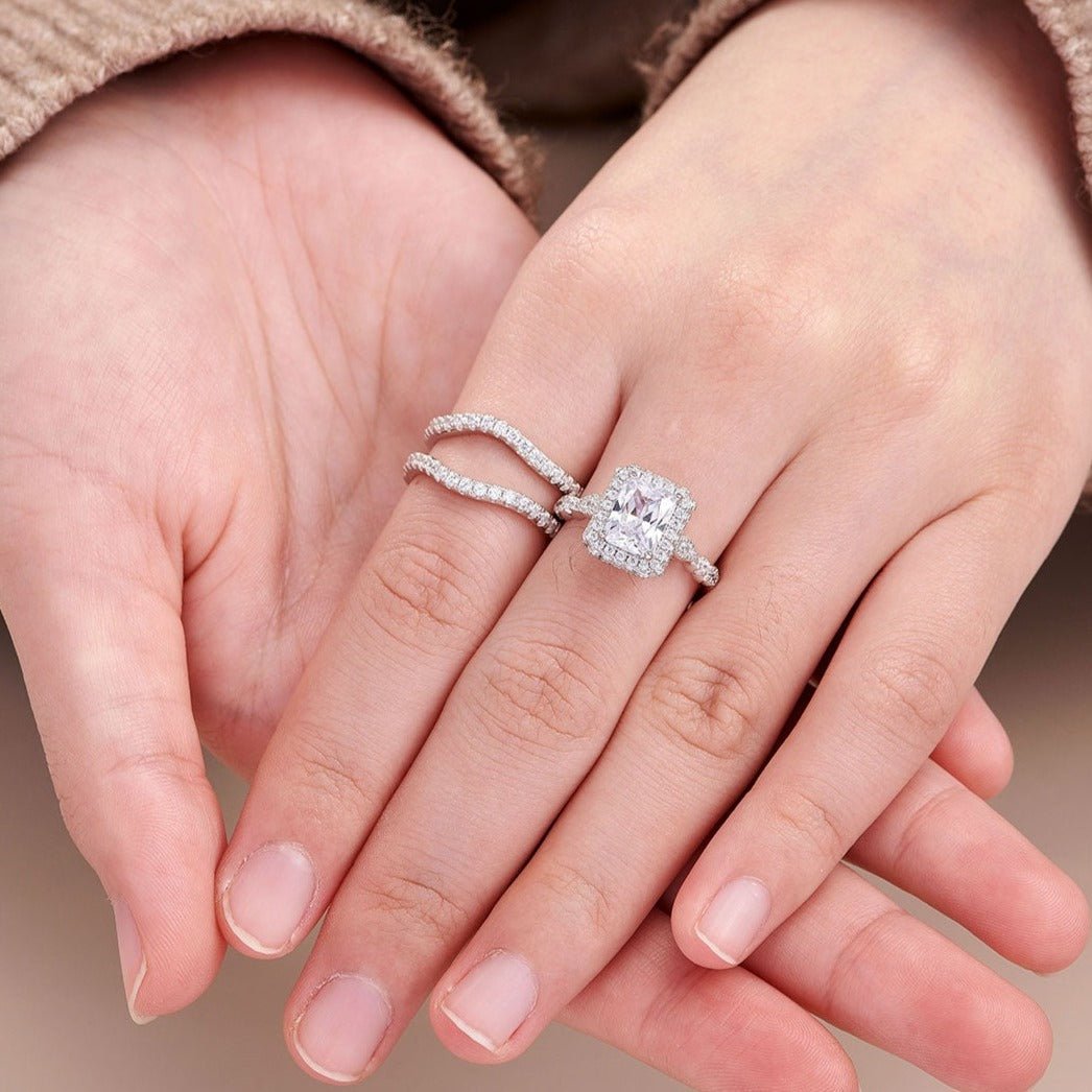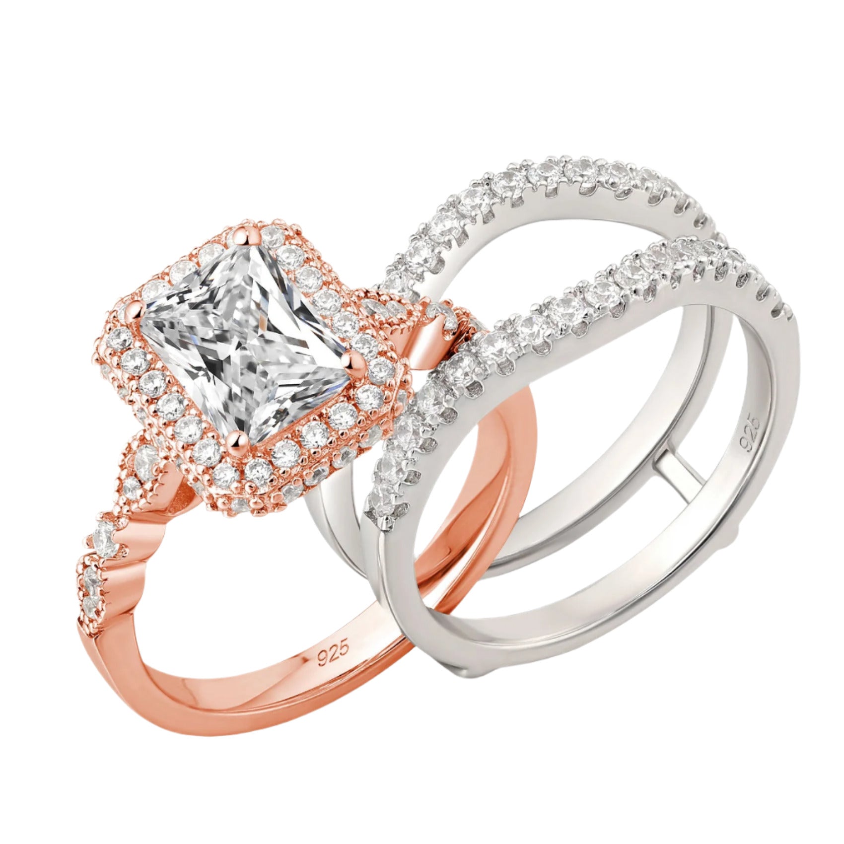 Introducing the Radiant Cut Diamond Alternative Wedding Ring Set by Black Diamonds New York - a stunning and enthralling symbol of love. Crafted with high-quality materials, this affordable set features a radiant cut center stone that captures the light from all angles, creating a breathtaking sparkle. The gorgeous 925 silver base dipped five times in 18k gold adds a touch of elegance to this exquisite piece. Celebrate your special day with this remarkable ring set that symbolizes the brilliance of your love story.
