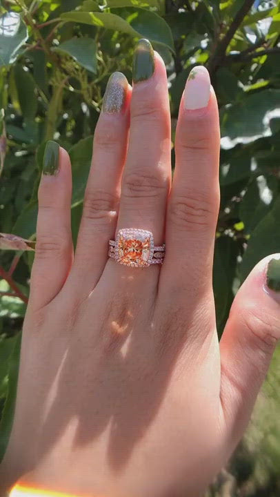 A stunning three-piece ring set featuring cushion-cut champagne stones in rose gold. Handcrafted with exquisite detail, this versatile set works beautifully as an engagement ring, wedding band, or anniversary gift. Perfect for any special occasion.
