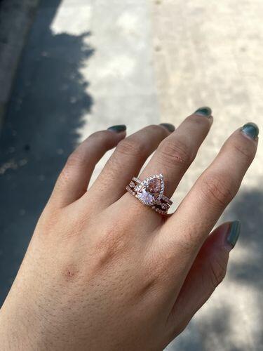 Indulge in luxury with our exclusive Rose Gold Halo ring set, featuring a Peachy Pink Simulated Morganite pear-cut center stone weighing 2.20 carats, surrounded by sparkling round-cut stones. The band, made of sterling silver and plated in rose gold, features matching round-cut stones in a clear color. Be the epitome of elegance with this stunning 3pc ring set.