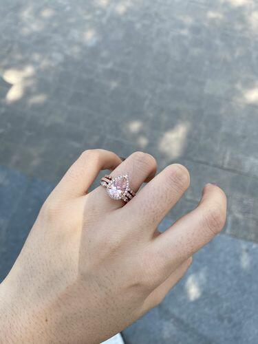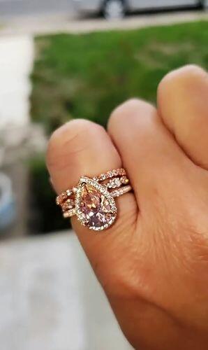 Rose Gold Halo Peachy Pink Simulated Morganite Pear Cut 3pc Ring Set