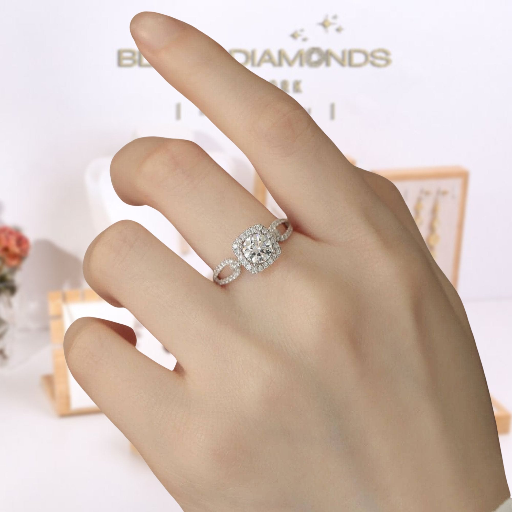 Round Cut 18k Halo Certified Moissanite Split Shank Engagement Ring