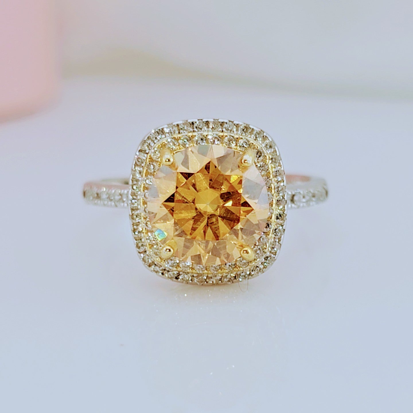 Say "I do" in style with our Round Cut 3.0 Ct Yellow Certified Moissanite Halo Engagement Ring. This gorgeous ring is designed to sparkle and shine, with a stunning yellow moissanite center stone and a halo of smaller stones that add extra brilliance. High quality meets affordability in this one-of-a-kind piece that is sure to take your breath away.