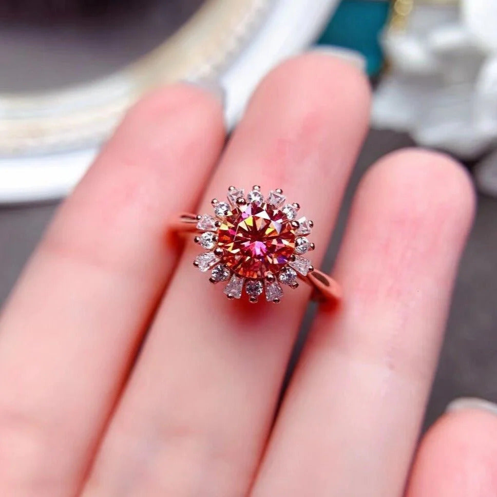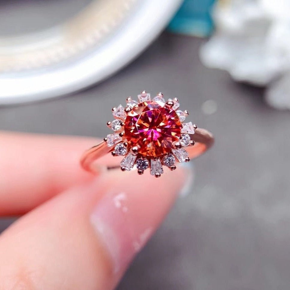 Introducing our exquisite Round Cut Red Certified Moissanite Flower Halo Engagement Ring, crafted to perfection with stunning red moissanite stone set in a beautifully designed flower halo. This celebrity-inspired ring is sure to make heads turn with its unique and sophisticated design. Its sparkling round cut stones enhance the beauty of the ring, making it the perfect choice for that special occasion!