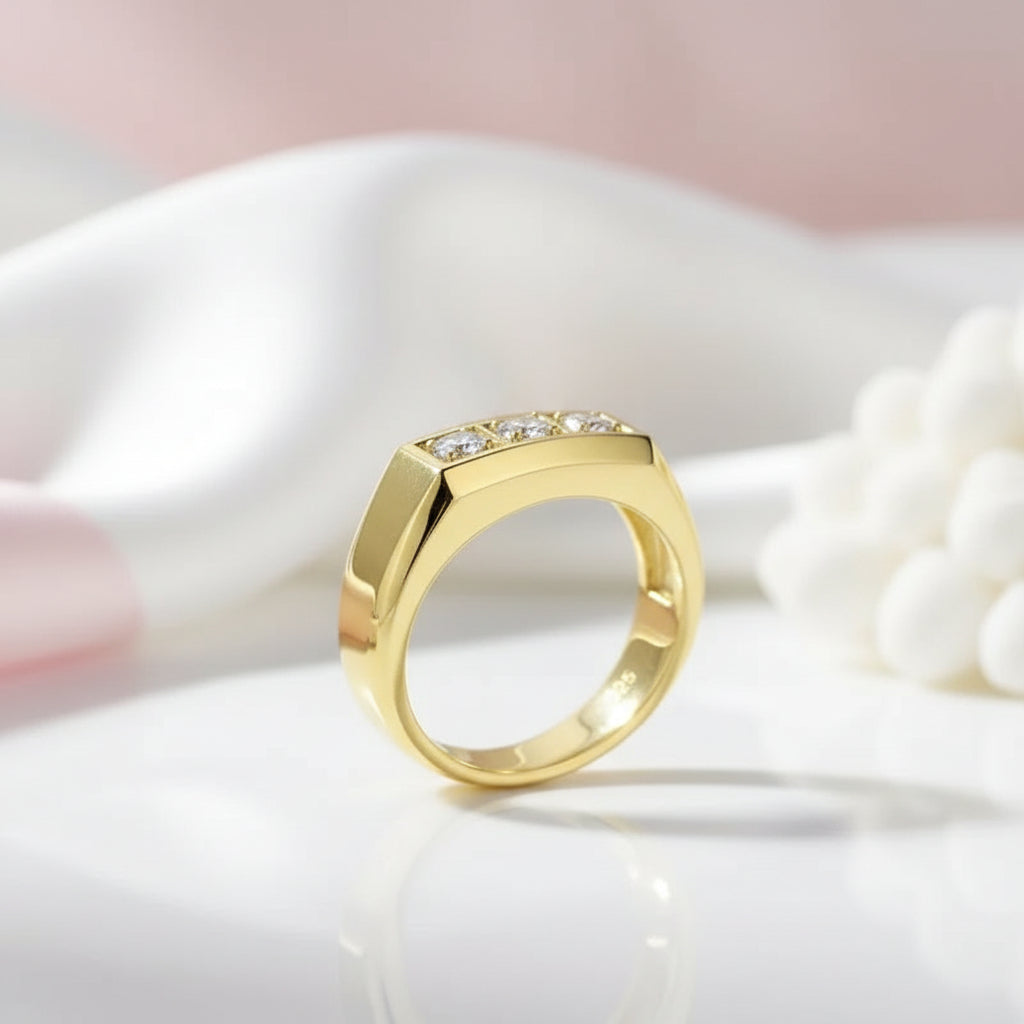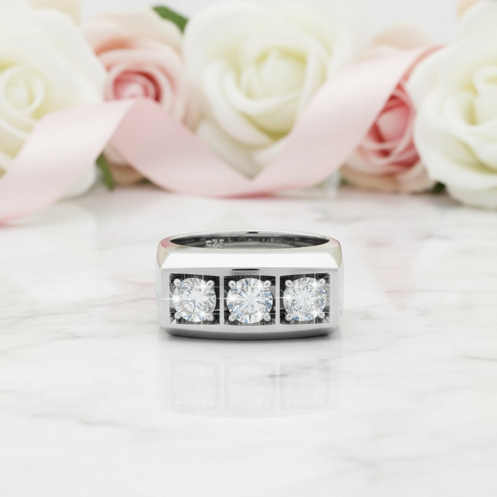 Mark your marriage with a three-stone diamond band that refuses to blend in. Constructed from responsibly sourced, high-grade materials designed for lasting durability, this piece sidesteps the tired designs and inflated costs of typical wedding bands. A ring as genuine as your commitment.