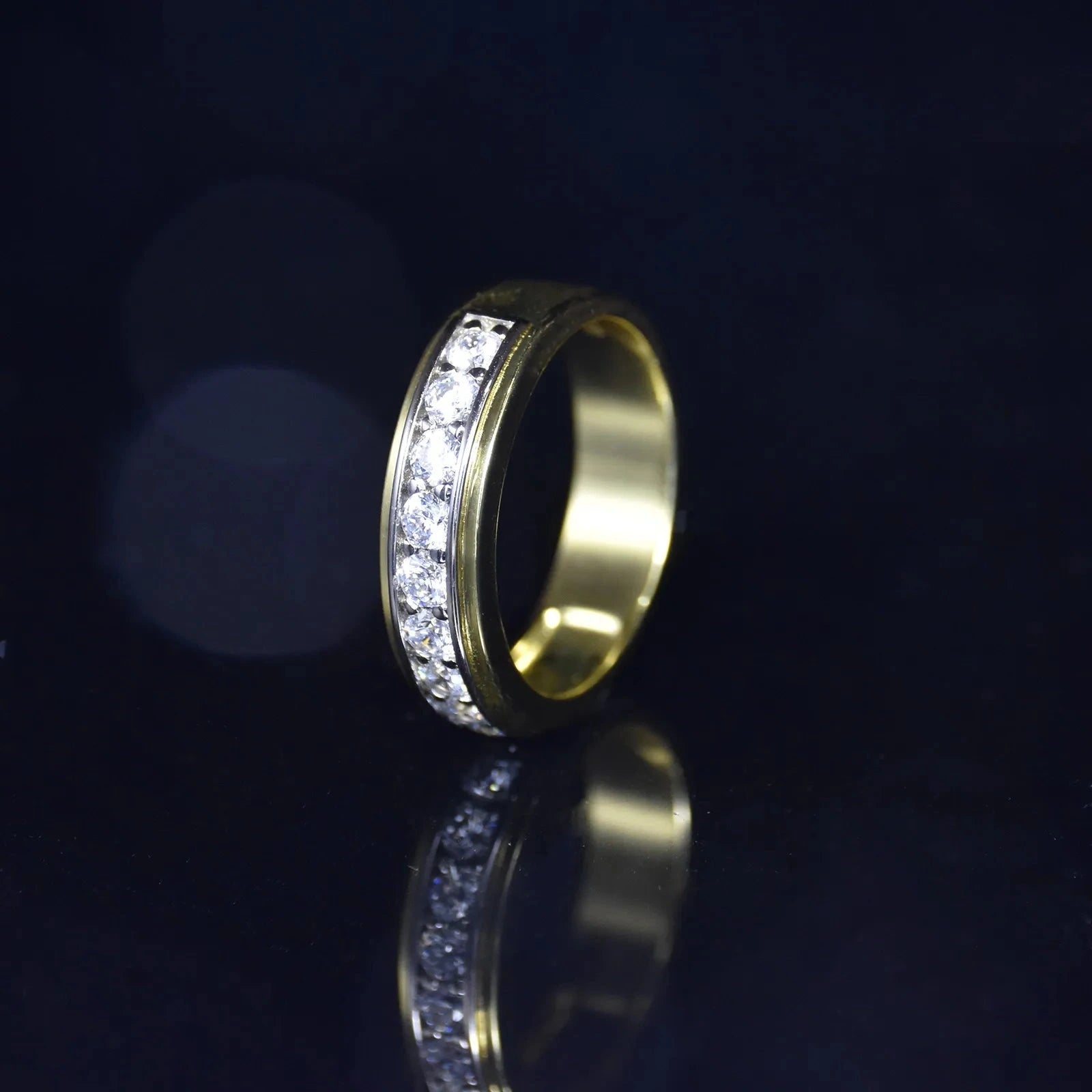 Seeking a timeless accessory that seamlessly blends simplicity and sophistication? Look no further than our exquisite Two-Tone Brilliant Round Cut Men's Ring Band! Featuring a row of shimmering EVN stones meticulously set on a two-tone band, this ring effortlessly combines elegance and versatility. The round cut stones symbolize enduring beauty and craftsmanship, reflecting your impeccable taste in fine jewelry. Whether it's a casual gathering or a formal event, elevate your style effortlessly with this stunning men's ring that exudes charm and sophistication.