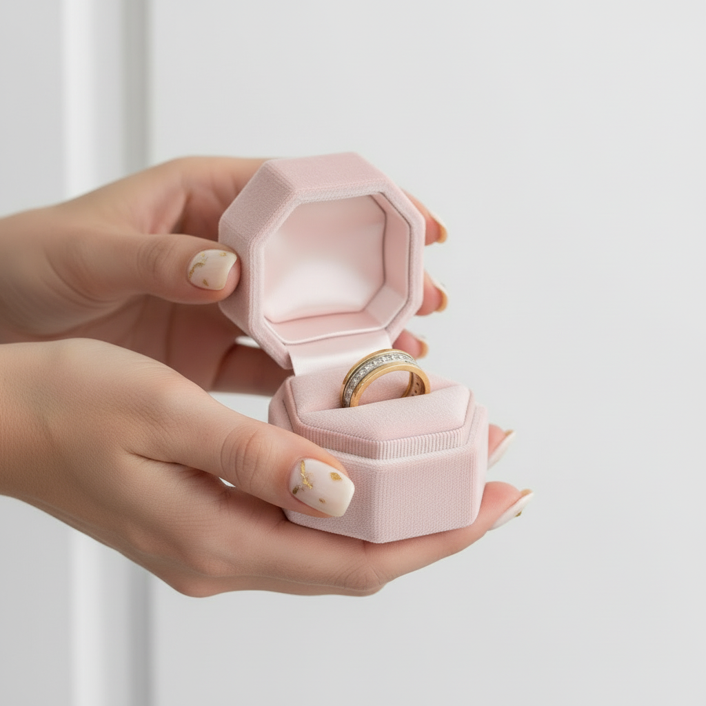 Rose gold ring and diamond ring on a pink velvet box with blurred flowers in the background