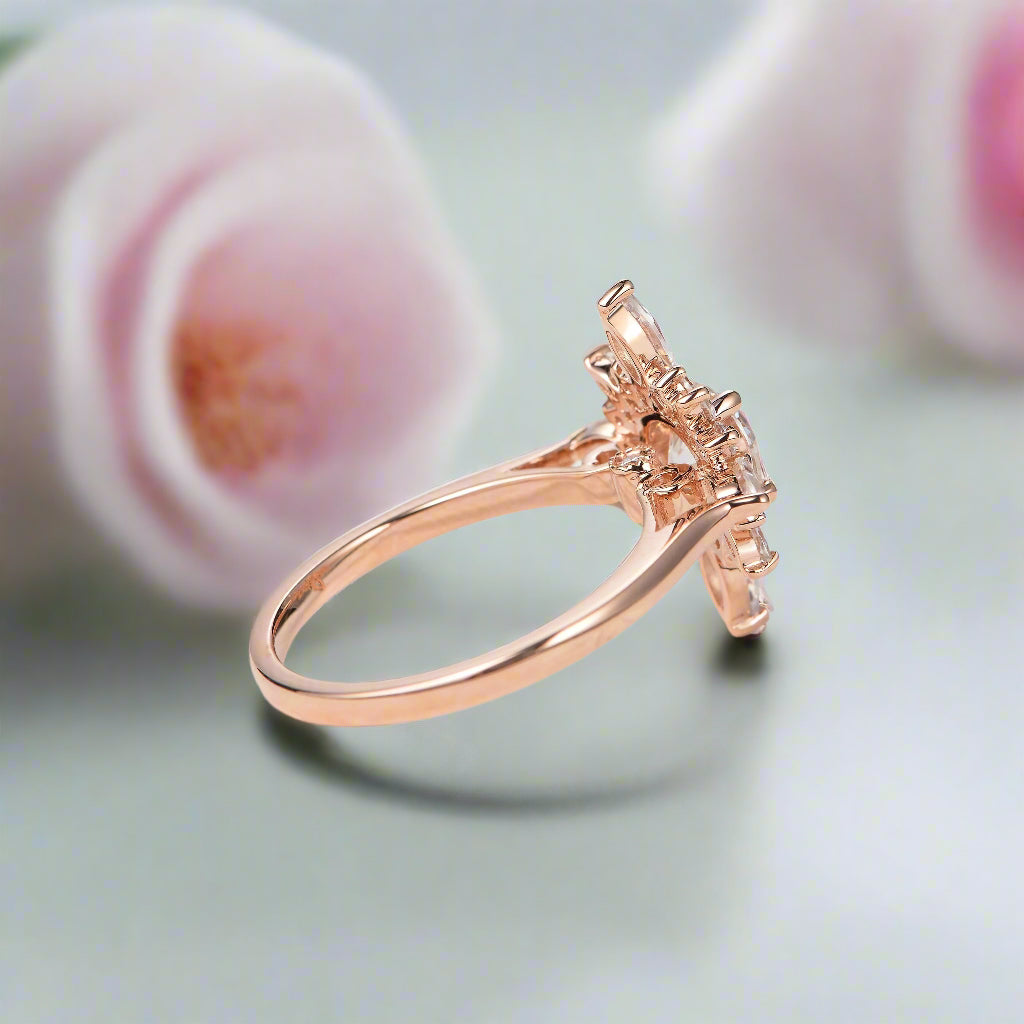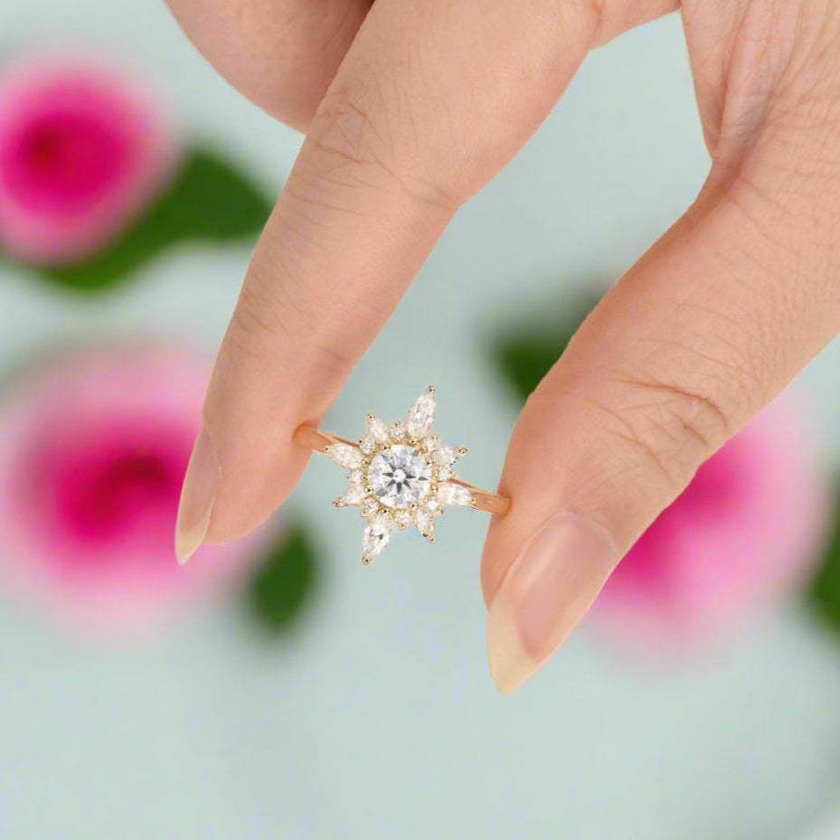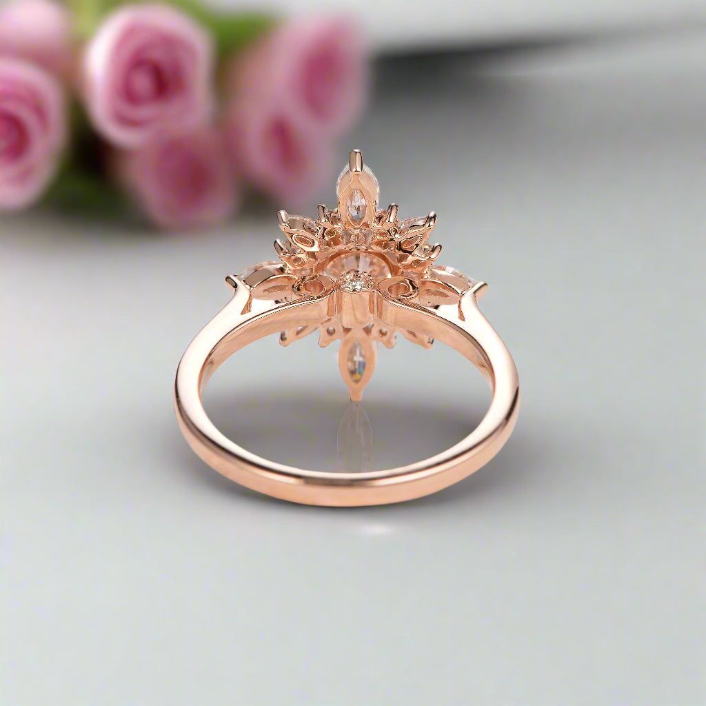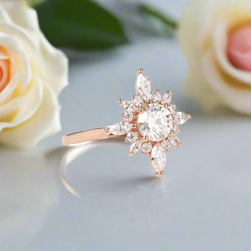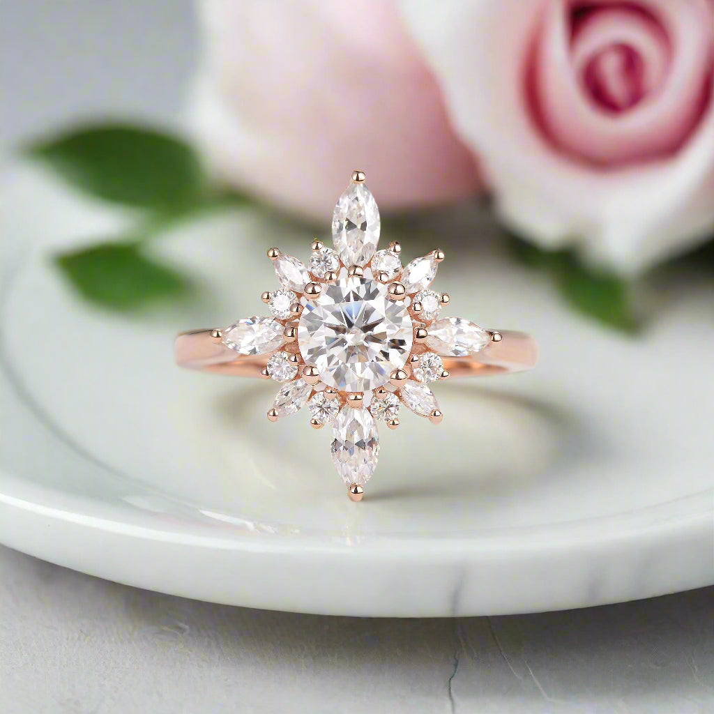 Elevate the essence of eternal love with our Unique 18k Rose Gold Certified Moissanite Engagement Ring by Black Diamonds New York. Crafted with uncompromising excellence in stunning 18k rose gold, this exquisite piece showcases an ethereal flower-style design adorned with a lustrous round center stone. Mesmerizingly sparkly and perfectly complemented by the intricate metalwork, this high-quality masterpiece is a testament to timeless elegance. Prepare to be captivated by its unparalleled beauty and affordable luxury - a majestic symbol of your enduring commitment.