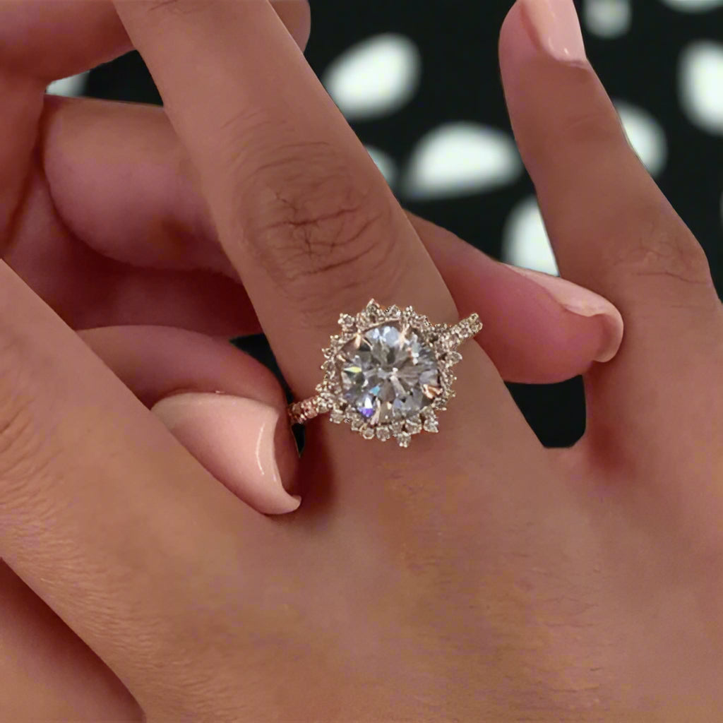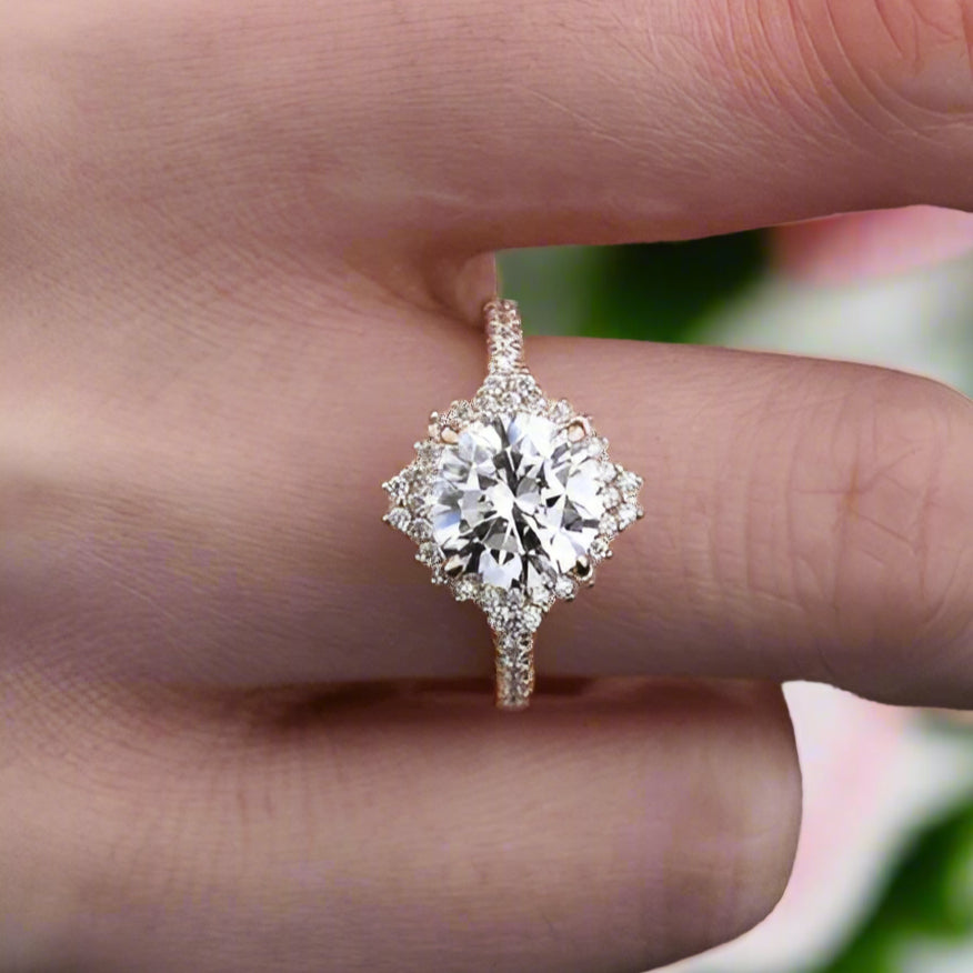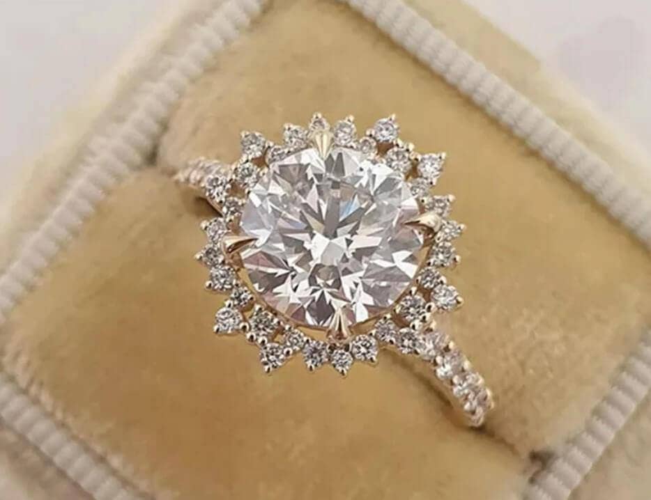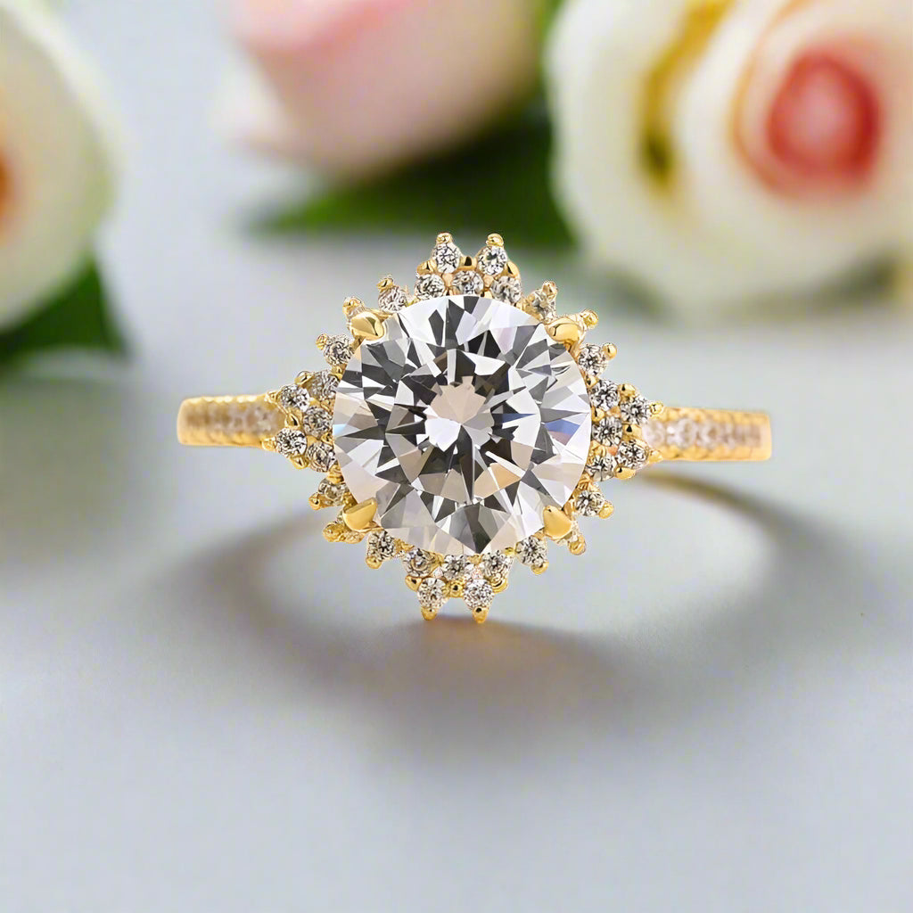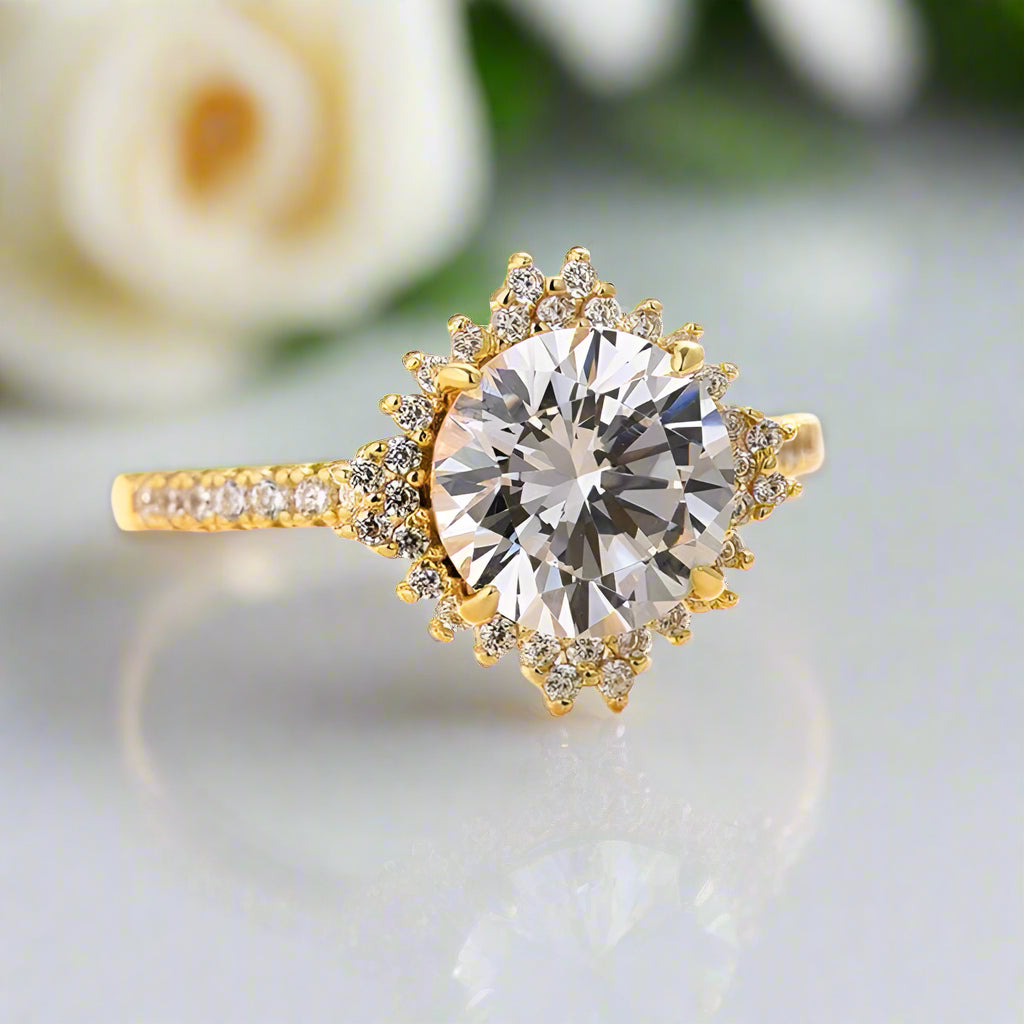 Unique Flower Halo Design Round Cut Yellow Gold Engagement Ring