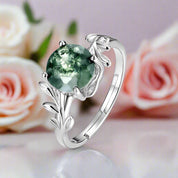 Indulge in extravagance with our Unique Olive Branch Moss Agate Natural Adjustable Promise Ring. Crafted with impeccable attention to detail, this ring features a captivating round-cut agate stone set in lustrous silver 925 sterling. Its adjustable design allows for a perfect fit, ensuring both style and comfort. Elevate your jewelry collection with this exquisite piece, available in a prong setting.