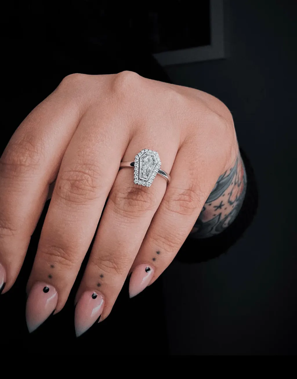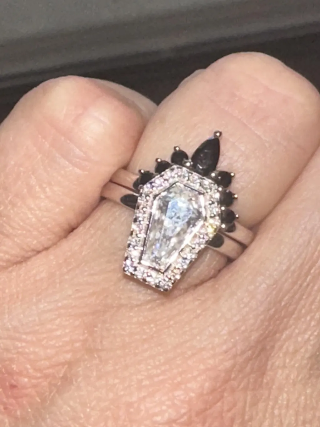 Declare your eternal love with the Until Death Ring Set, featuring a coffin shaped stone style in a stunning bezel setting and an enhancer band engraved with ‘Till Death Do Us Part.’ Handcrafted in 14k white gold (also available in rose, yellow, or platinum), this gothic wedding ring set is perfect for alternative brides who crave unique, timeless elegance.