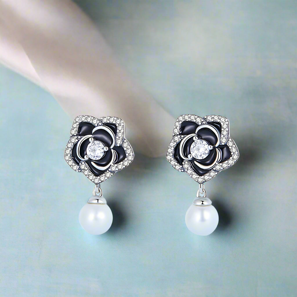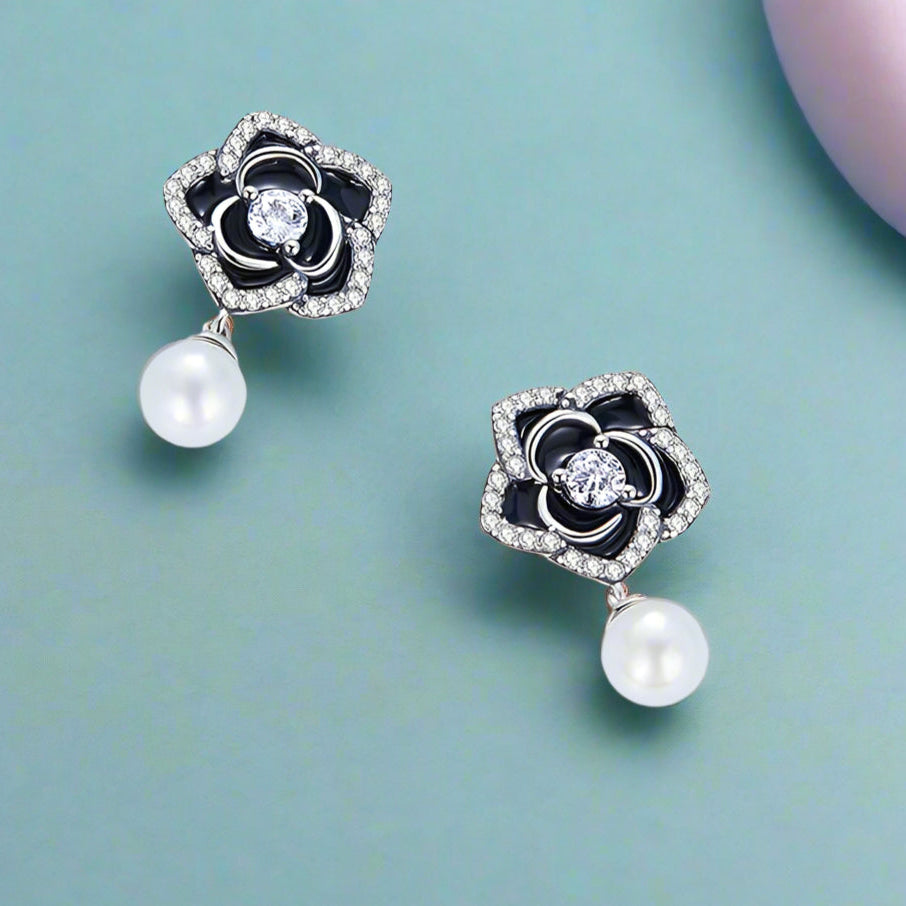 Shine unexpectedly with Black Diamonds New York's Vintage Black Camellia with Pearl Stud Earrings! Crafted from a sophisticated blend of 92.5% pure silver and 7.5% high-quality and hypoallergenic metals, this beautiful accessory features a camellia surrounded by shimmering diamonds. The contrast of the smooth and delicate black enamel with the noble and elegant pure pearl is sure to attract attention. Fortunately, extravagance doesn't have to be expensive with these affordable earrings!