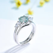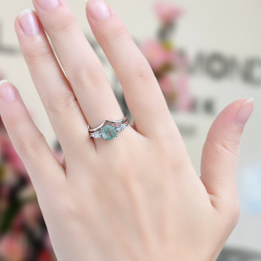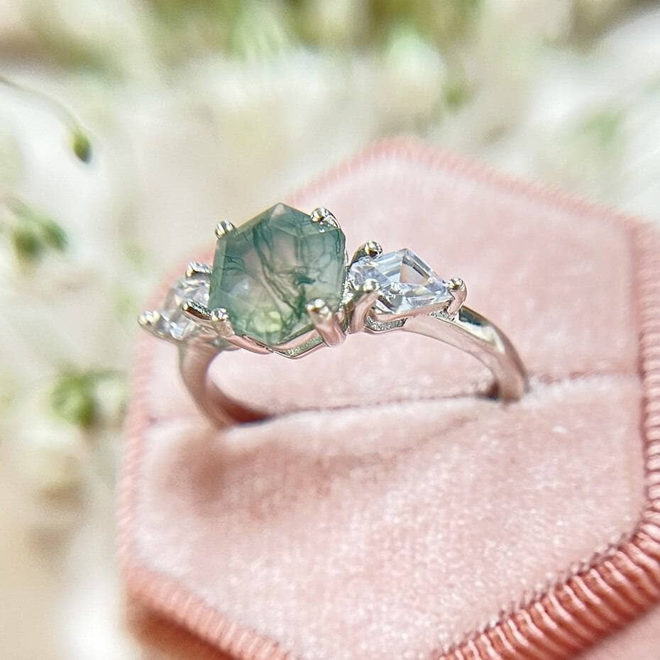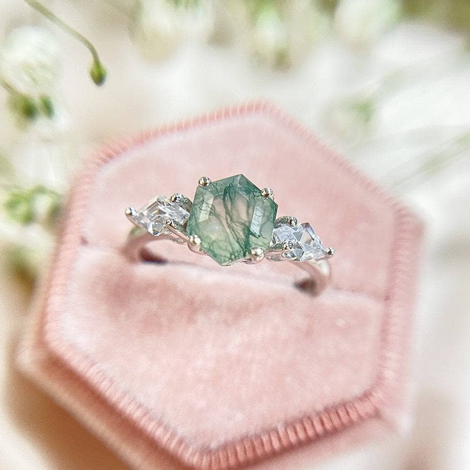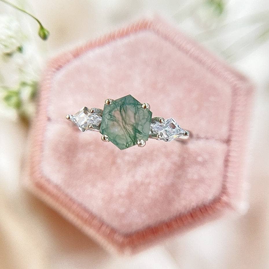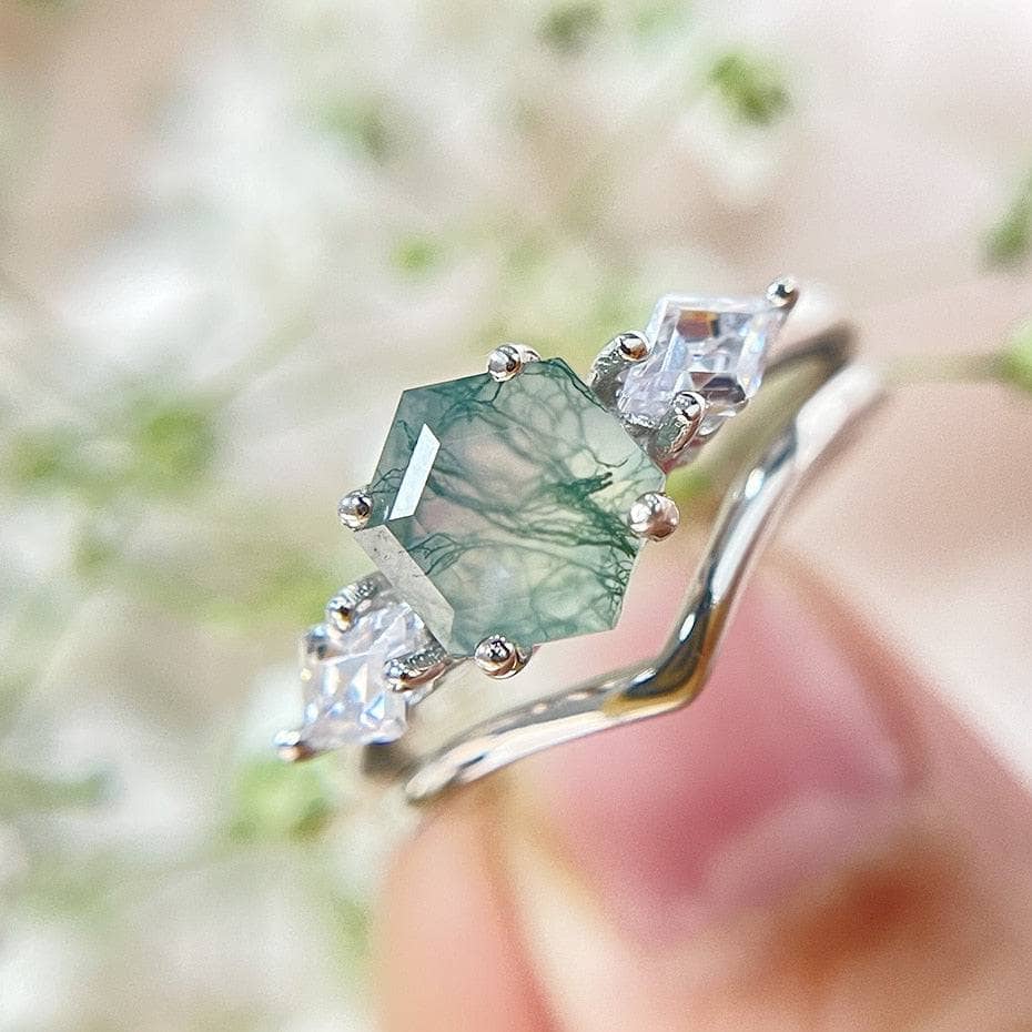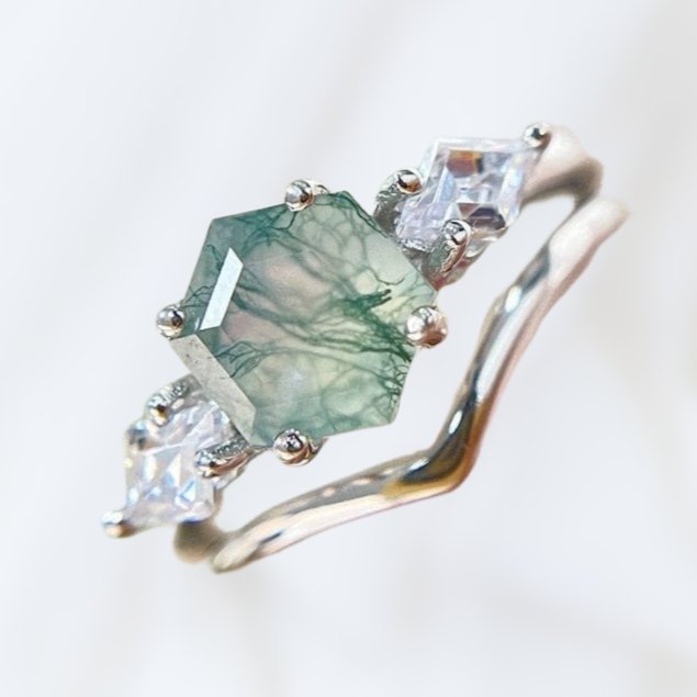 Hexagon Natural Moss Agate Engagement Ring Set Upgrade