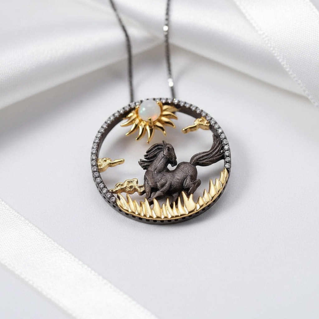 Celebrate the spirit of movement and grace with this handcrafted galloping horse necklace, featuring a striking natural African opal pendant. Each piece is individually designed, showcasing the stone's mesmerizing play of color and light. Perfect for those who appreciate artisanal jewelry that tells a story and captures the essence of strength and elegance.