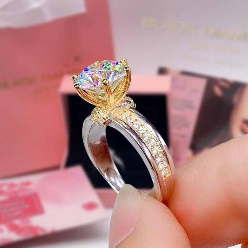 Your search for the perfect engagement ring ends here with our Yellow Gold Sparkling Certified Moissanite Engagement Ring. Adorned with a 3 carat round cut moissanite diamond, this piece radiates beauty and charm. Embrace the stunning sparkle and high quality of this affordable ring, making it the ideal choice to celebrate your love in style.