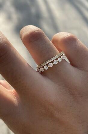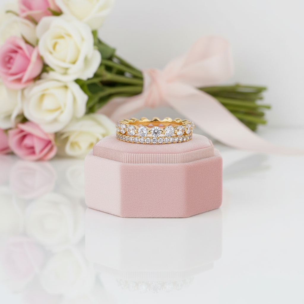 Built from 925 sterling silver with yellow gold plating and hand-set stones, this stackable band set adapts to your style. Layer them for a complete bridal statement or wear individually for everyday sparkle. Perfect for marking engagements, anniversaries, and life's precious moments, a gift that becomes part of your story.